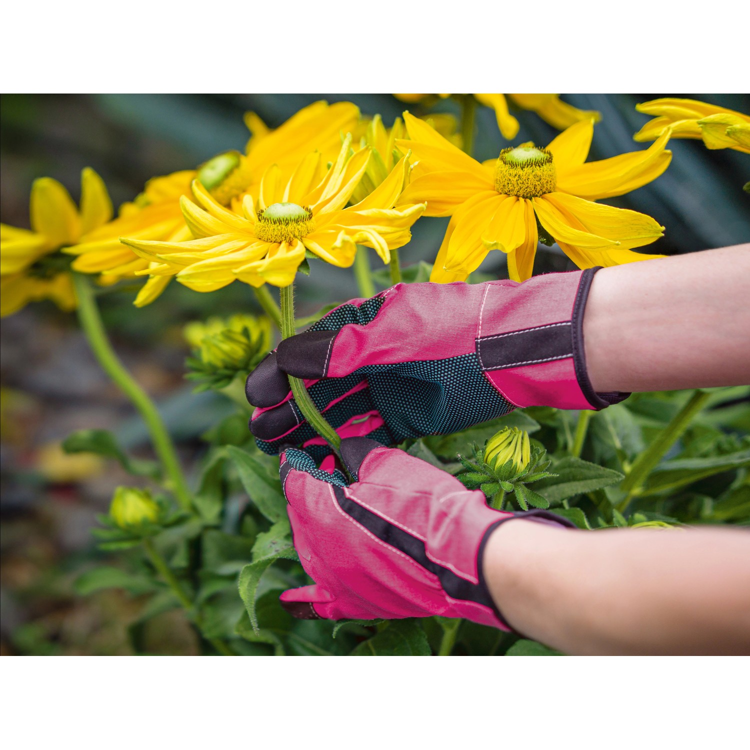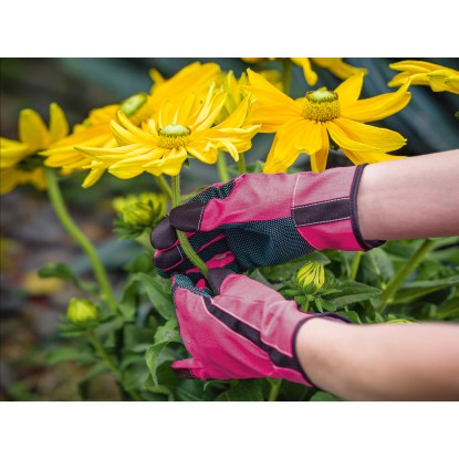 Questi leggeri guanti da giardinaggio sono ideali per lavorare a secco con piante e fiori. Hanno una vestibilità più stretta rispetto ai tradizionali guanti da giardino e sono indicati anche per lavori più precisi. I guanti sono realizzati in cotone elastico nel colore rosa e sono di taglia 7. Sul lato interno grigio è presente un rivestimento antiscivolo a pallini in PVC. Utilizzo del touchscreen possibile con l`indice, il medio e il pollice. Sulla superficie esterna delle dita è applicato un rinforzo in ecopelle nero. I guanti da giardinaggio sono conformi alla norma europea EN 420 sui requisiti generali per i guanti protettivi. La fornitura include un paio di guanti.