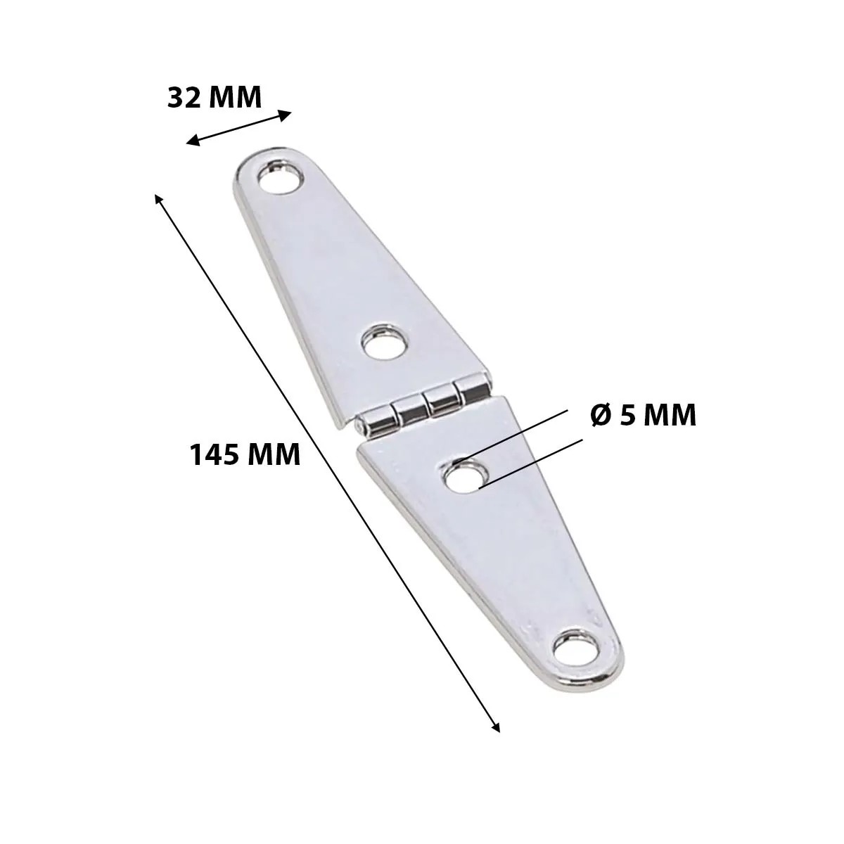 Cerniera inox. Misure: 145x32x1,2 mm, Ø fori 5 mm. Ideale in ambito nautico per barche, yacht e altre imbarcazioni. Utilizzata per garantire sicurezza delle strutture e durabilità.