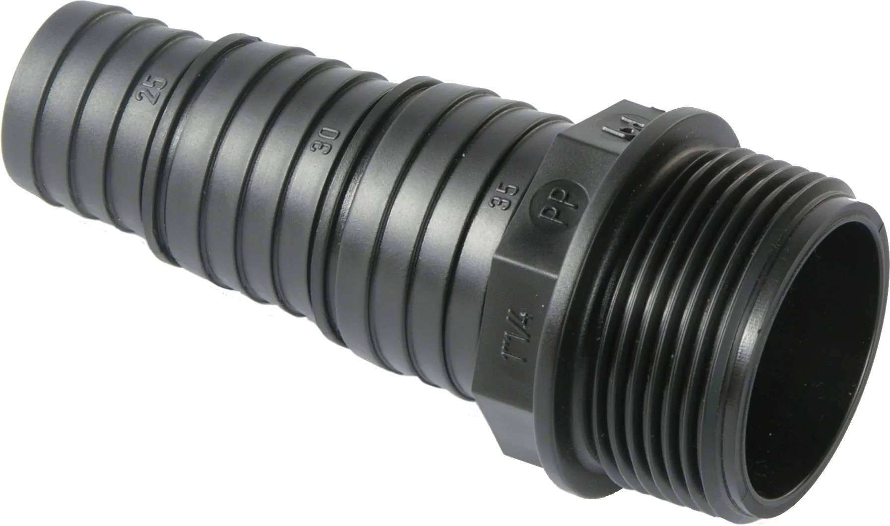Raccordo portagomma diritto gradinato in polipropilene con filetto maschio e misura 1"1/4 (25 mm x 30 mm x 35 mm)