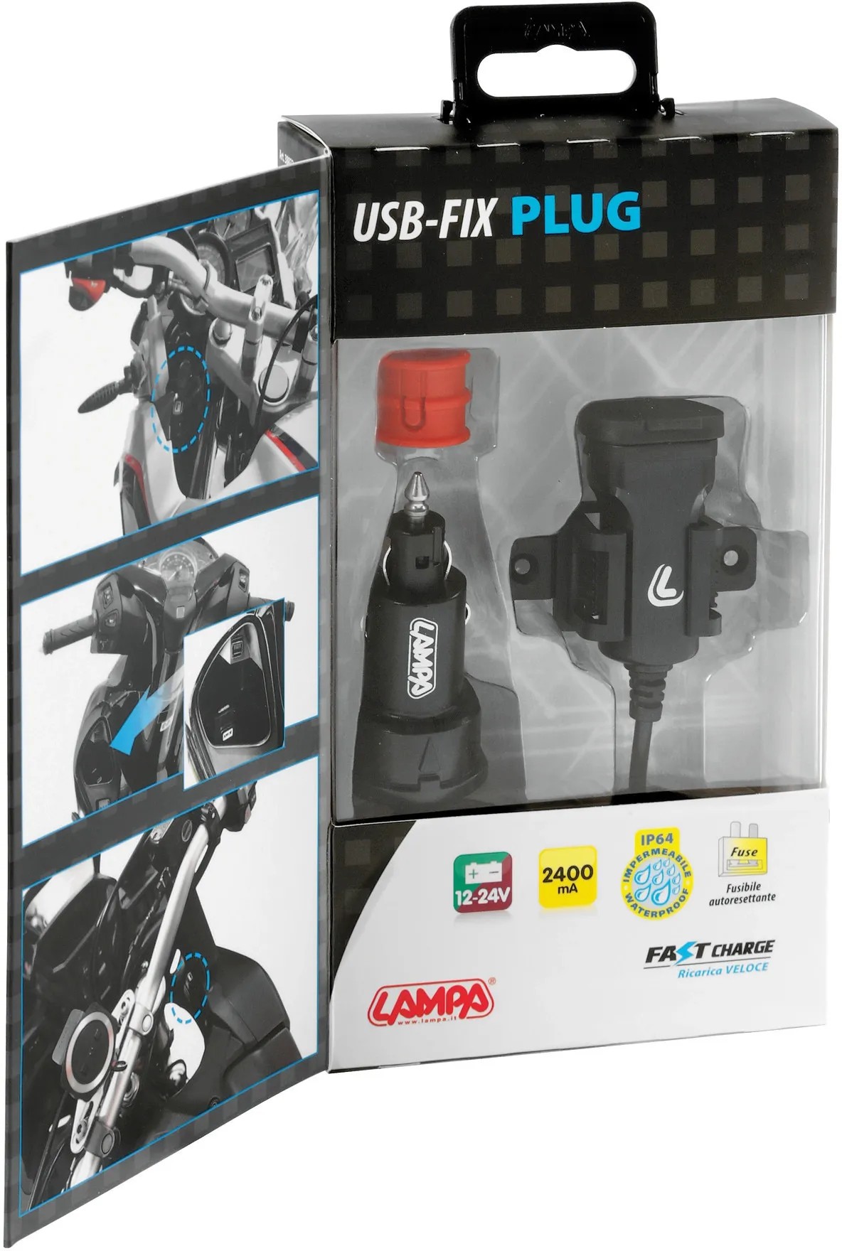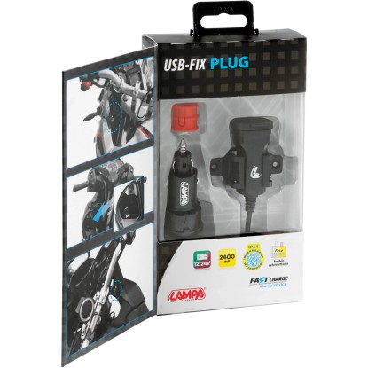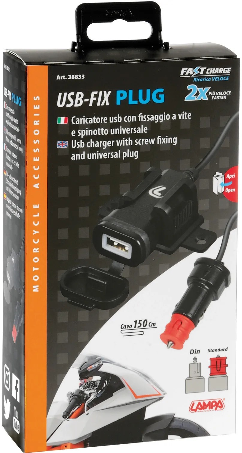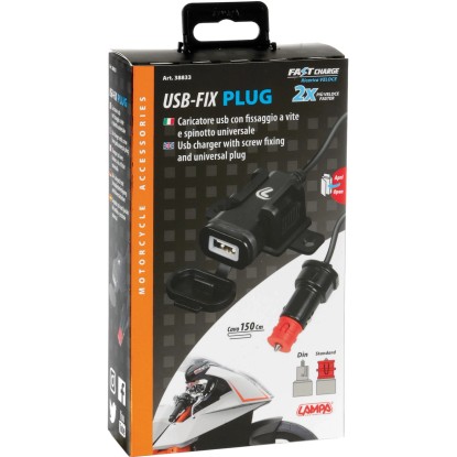 Caricatore USB con chip intelligente che riconosce il dispositivo collegato e fornisce energia ottimale per una ricarica veloce e protetta. Protezione da corto circuito, surriscaldamento, sovraccarico, sovratensione. Design compatto, facilmente rimovibile. Fissaggio tramite viti o biadesivo (inclusi). Cavo da 150 cm con connettore universale compatibile con prese Din e Standard.