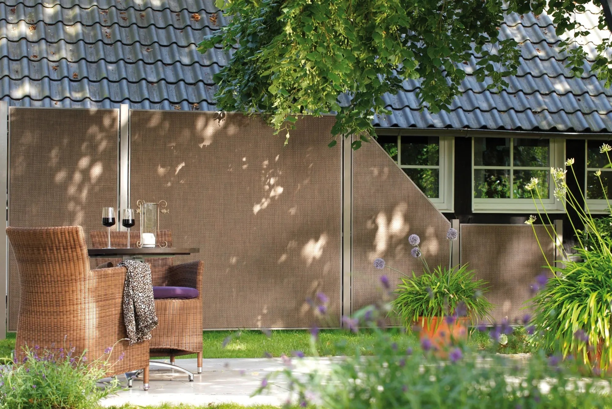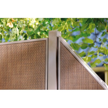 L'elemento di raccordo Weave Lüx bronzo presenta una struttura stabile, incorniciata da un telaio perimetrale in alluminio, rivestito su entrambi i lati con tessuto di textilene, un materiale resistente e di facile manutenzione. La caratteristica chiave di questo elemento di raccordo è la sospensione integrata sul telaio, che permette un'installazione rapida e senza complicazioni degli elementi. L'elemento di raccordo Weave Lüx bronzo non solo offre una solida struttura, ma anche un'ottima resistenza alle intemperie e alla corrosione grazie all'uso dell'alluminio e del tessuto di textilene.