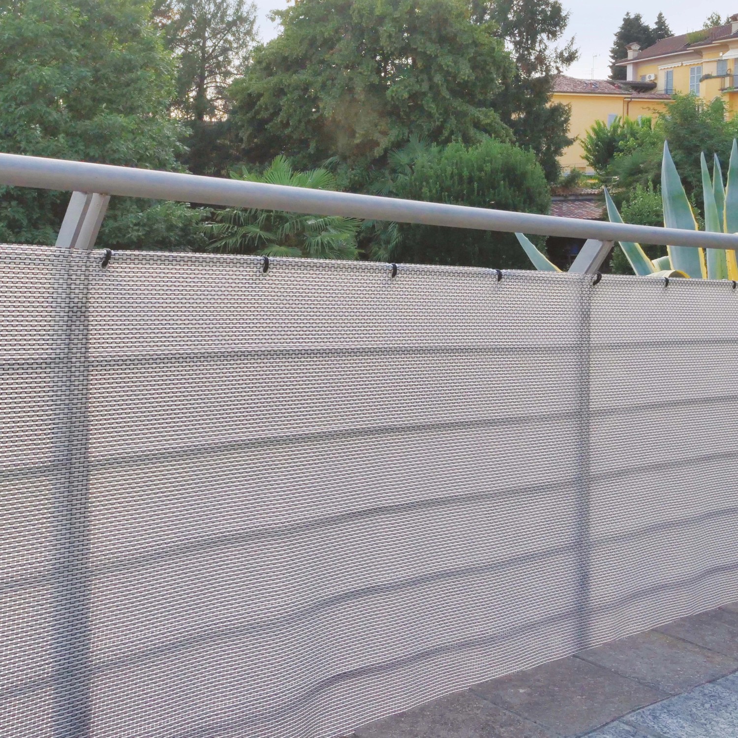 Rete tessuta frangivista decorativa, adatta a qualsiasi tipo di architettura. Si taglia a misura, non si sfilaccia, resistente e indemagliabile. Prodotta in textilene, 70% PVC e 30% PET (poliestere). Con occhielli antiruggine disposti ogni 30 cm circa lungo il bordo superiore e inferiore, che agevolano l'installazione e il fissaggio. Stabilizzata ai raggi UV, resiste a vento, sole e intemperie. Si taglia senza sfilacciarsi. Fili ampi di colore argento intrecciati a fili più sottili in nero per una tessitura a elevato impatto estetico, altamente schermante. Protegge la privacy e permette di decorare con stile anche le costruzioni più moderne. Ideale per giardini, recinzioni, terrazze o balconi. Perfetta per proteggere, schermare e decorare.