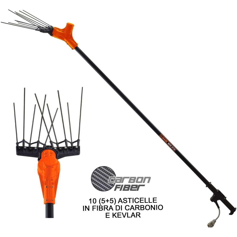 Scuotiolive a batteria MAORI MSC 3710. Motore a spazzole 370 Watt da 1550 giri/min, 12 V. Asta in alluminio da 30 mm, 10 (5+5) pettini in fibra di carbonio e kevlar a movimento orizzontale contrapposto per una larghezza di lavoro fino a 390 mm. In dotazione prolunga da 1 metro e cavo di alimentazione da 10 metri.