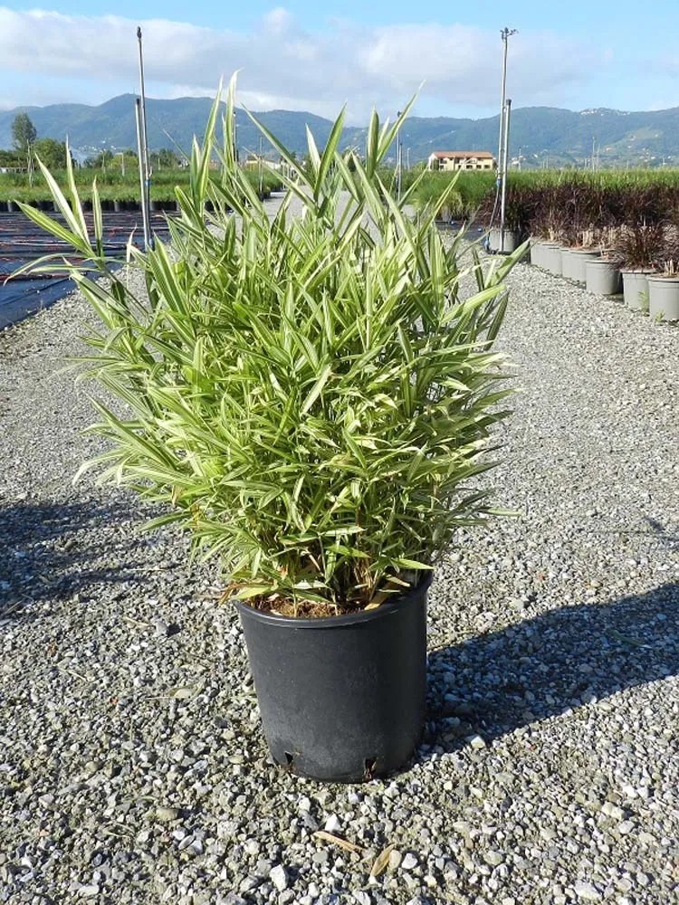Foglie lunghe 10-11 cm, larghe 1-1,5 cm, striate di verde e bianco crema. Portamento eretto, denso e cespuglioso. Molto indicato per bordure e per fissare terreni in pendio. Tutti originari del Giappone e tutti traccianti, i bambù nani hanno culmi molto sottili, fittamente vestiti di piccole foglie regolarmente disposte per tutta la loro lunghezza. Sono molto utili in giardinaggio, per sottobosco, per bordure, come tappezzanti e nel giardino roccioso. Molto impiegati anche in vaso o per composizioni in fioriere. Diventano più belli, più compatti e più densi se vengono potati a fine inverno.