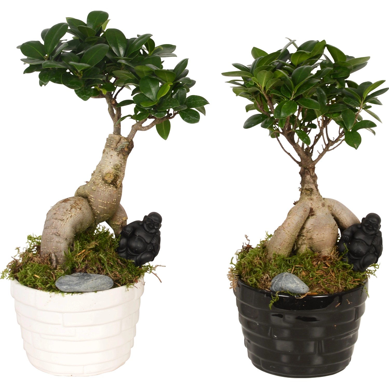 La composizione di bonsai è si caratterizza per una combinazione incantevole tra un Ficus Ginseng e elementi decorativi asiatici.