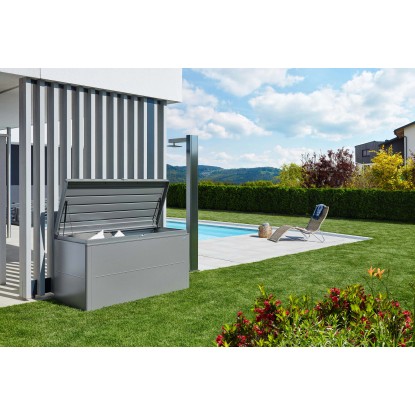 Il contenitore LoungeBox Biohort 160, nella sua finitura grigio, rappresenta la soluzione perfetta per conservare cuscini e attrezzi da giardino in modo pratico ed elegante.