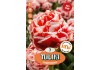 I tulipani producono fiori doppi di dimensioni eccezionali, colorati di un vivace rosso scarlatto con bordi festosi dei petali in bianco, creando un contrasto affascinante.