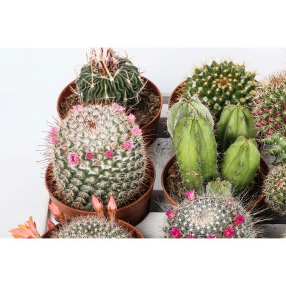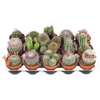 I cactus sono piante grasse affascinanti e tutte diverse! L`assortimento di piante grasse spinose è perfetta per aggiungere un tocco esotico e originale a qualsiasi ambiente. La selezione include varietà appartenenti a diverse famiglie botaniche, come Mammillaria, Notocactus, Ferocactus, Gymnocalycium e Cereus, ognuna con forme, colori e texture uniche che creano un mix armonioso e decorativo.