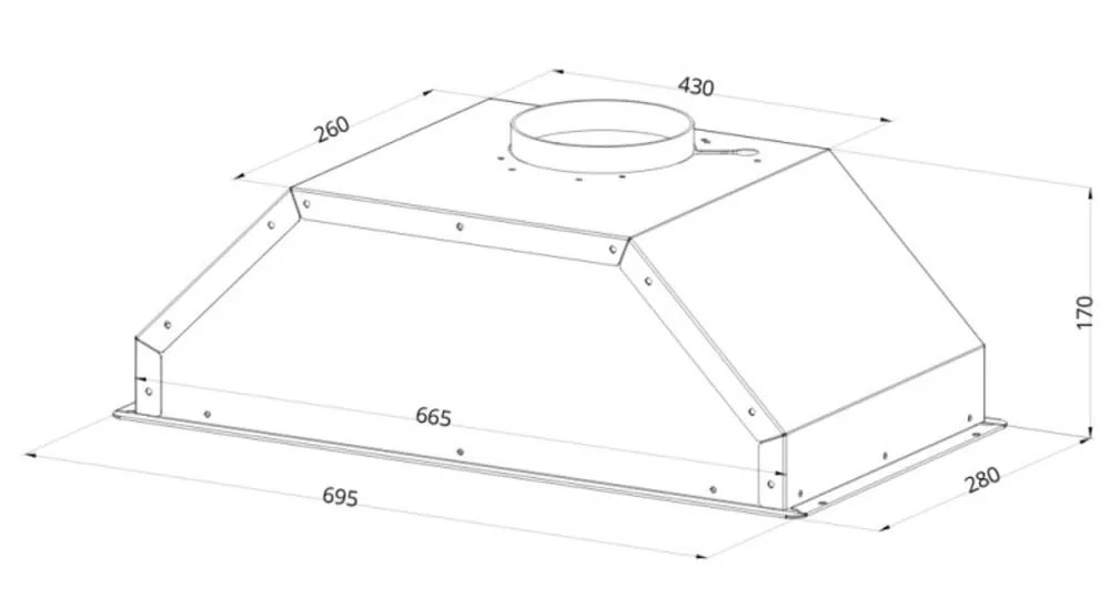 La cappa è progettata per essere montata sotto un pensile, occupando uno spazio di 695 mm in larghezza, 280 mm in profondità e 170 mm in altezza.