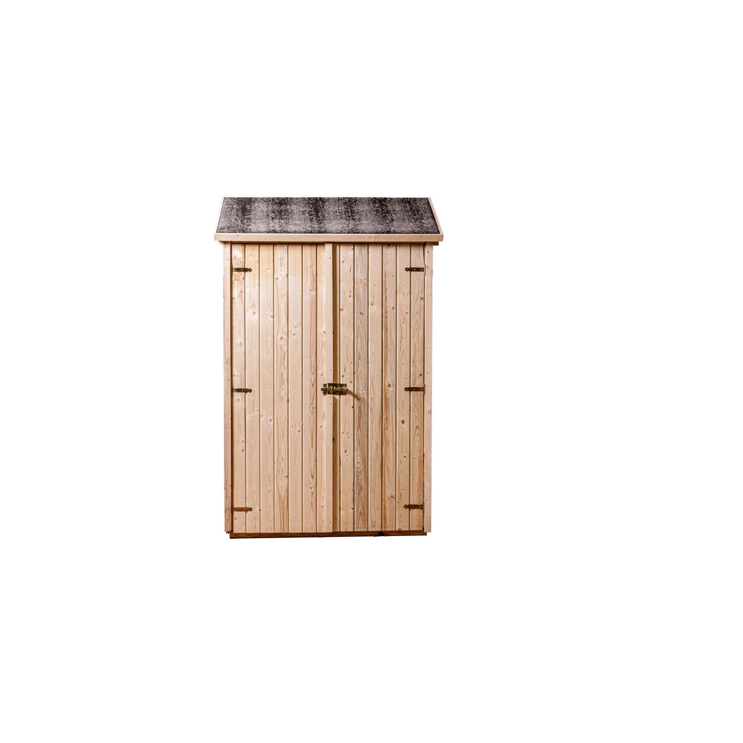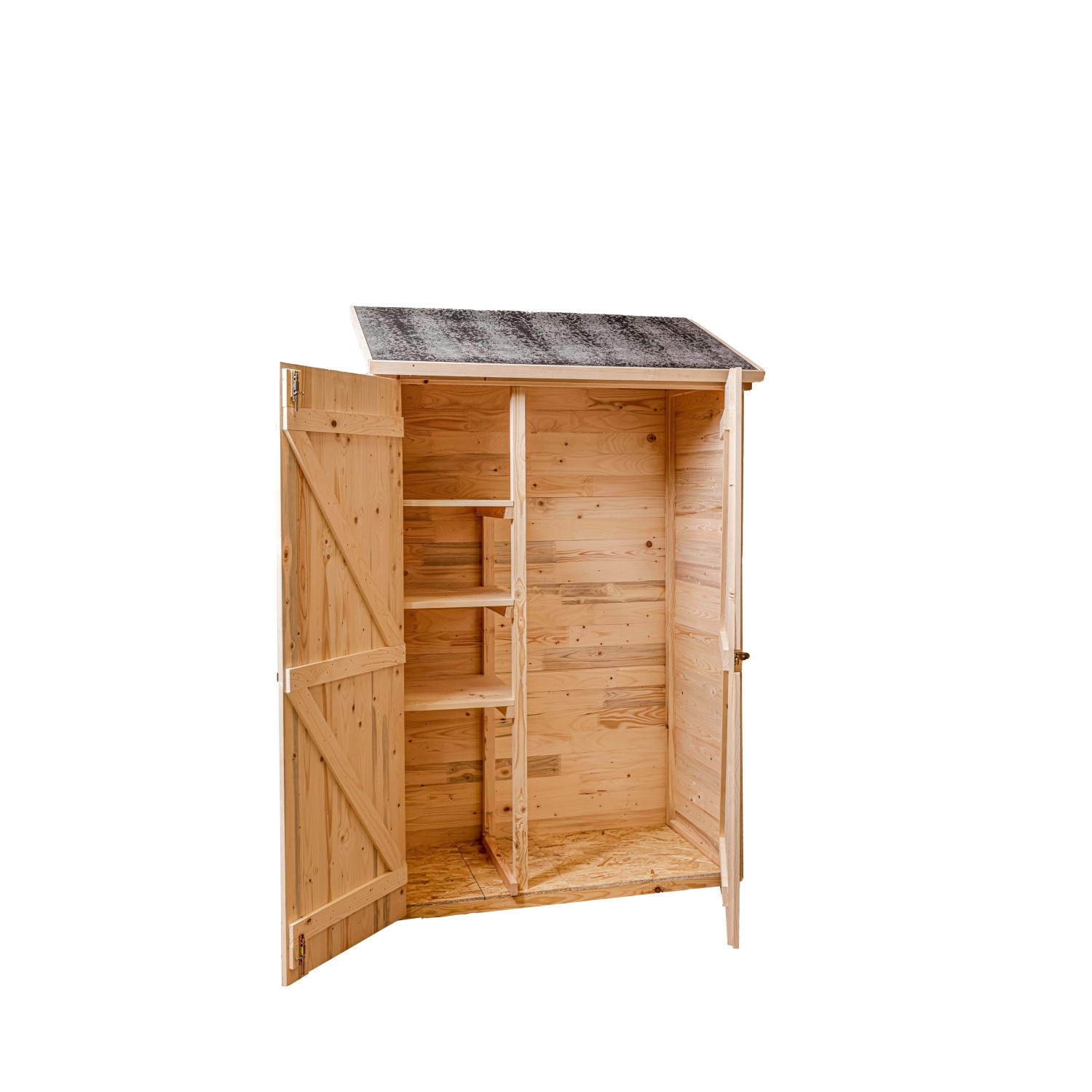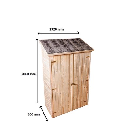Casetta-ripostiglio a pannelli 16 mm, con pavimento, dimensioni a terra 120x60 cm. Dotato di copertura in bitume e ripiani portaoggetti. Dimensioni complessive di 1,32x0,65m = 0,85 m² e dotata di porta doppia da 2x0,55x1,69 m