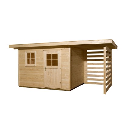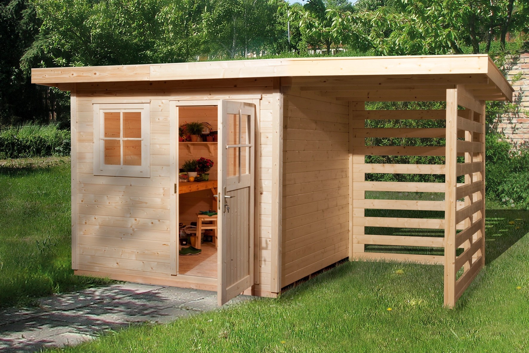 Casetta da giardino in legno con pratico tetto annesso