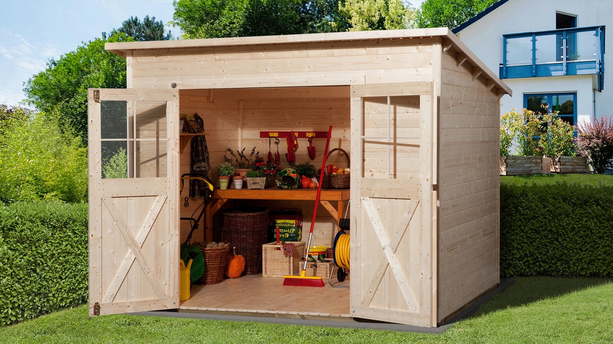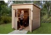 Realizzata con una struttura robusta, la casetta da giardino è costruita in legno non trattato utilizzando moduli componibili. Questa scelta di materiali preserva l`aspetto autentico e la venatura del legno. Per proteggerla dagli agenti atmosferici, è possibile personalizzare la superficie con una verniciatura o una velatura. La struttura della casetta è caratterizzata da uno spessore delle pareti di 19 mm, garantendo stabilità. Il tetto a doppia falda può sostenere un carico di neve massimo di 75 kg/m², assicurando resistenza anche nelle condizioni più avverse. L`altezza del colmo di 223 cm offre un ampio spazio interno, consentendo una libertà di movimento confortevole.