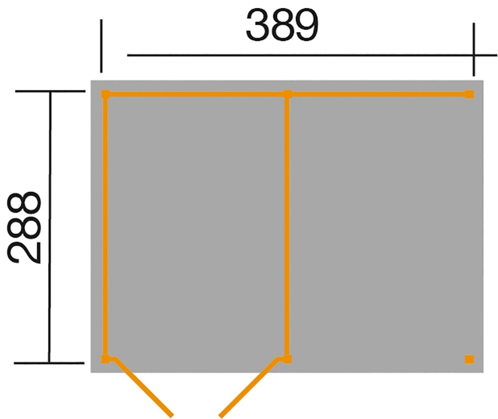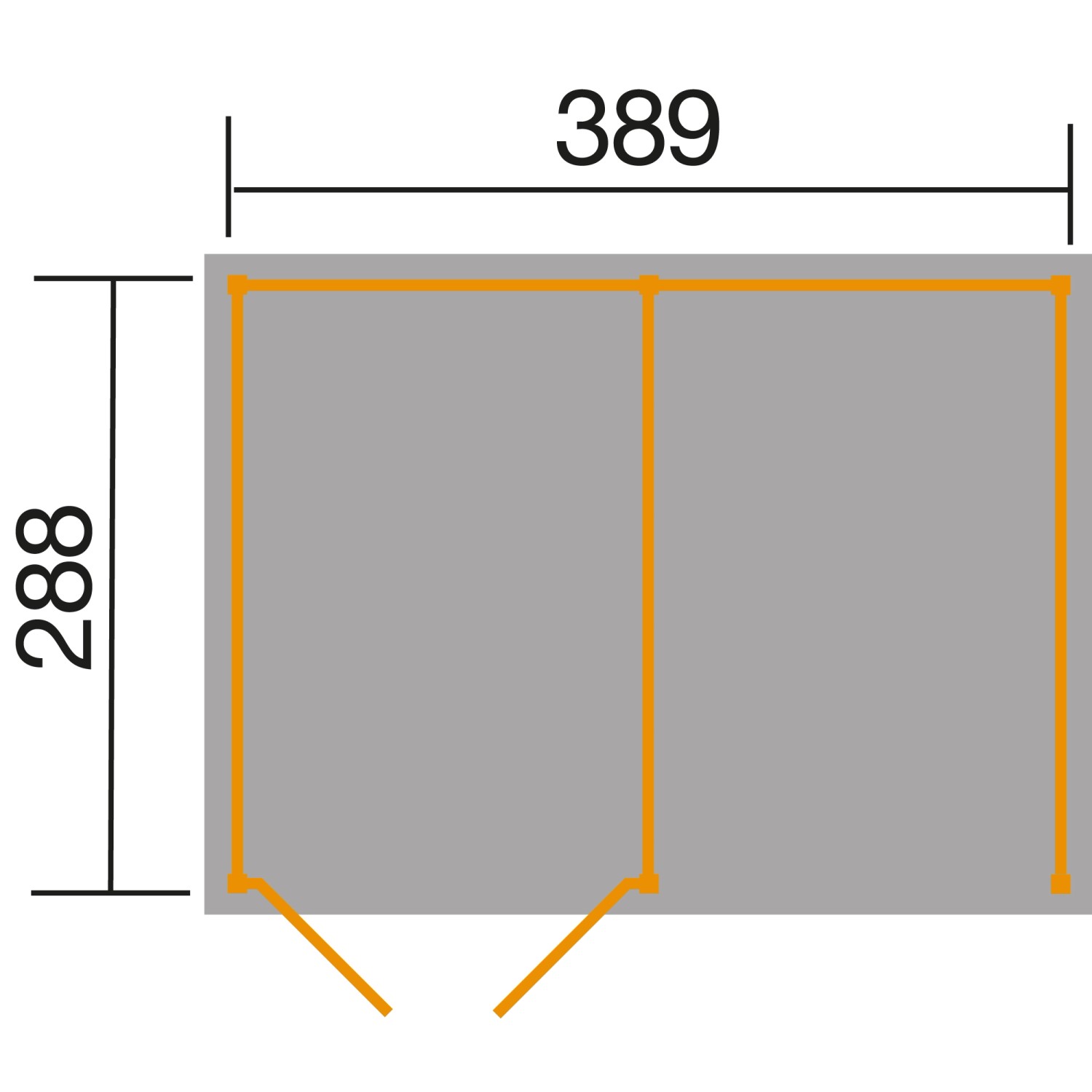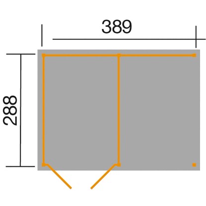 Casetta porta attrezzi 389x288 cm di cui 194 cm di pensilina laterale