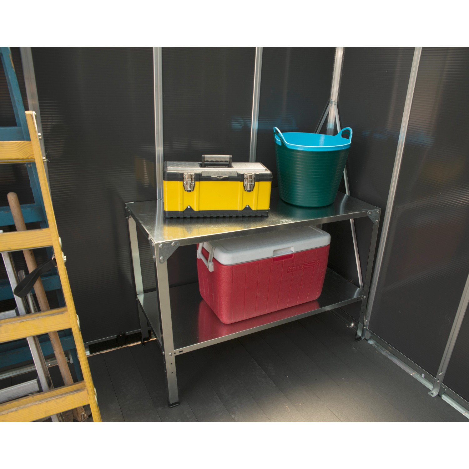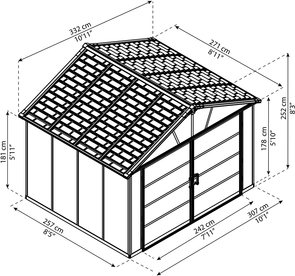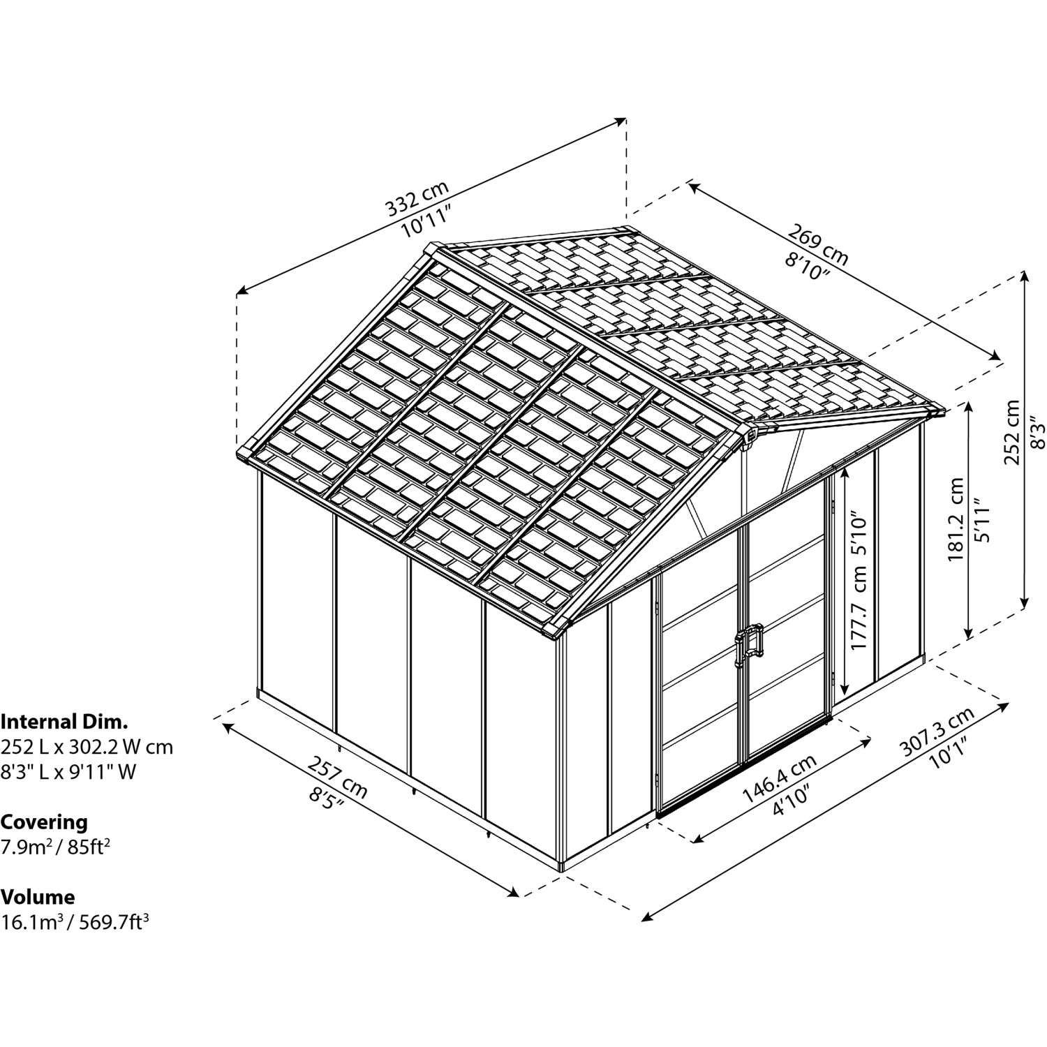 La casetta da giardino in PVC Palram Canopia in materiale sintetico grigio offre uno spazio ampio e versatile con una superficie di base di 9 m². L'ampio ingresso consente di accedere comodamente alla casa per gli attrezzi in plastica, anche con attrezzi più grandi, utensili da giardino, biciclette e mobili da giardino. Con una larghezza di passaggio di 148 cm e un'altezza di passaggio di 178 cm, questa casetta è progettata per soddisfare le tue esigenze di spazio e accessibilità.