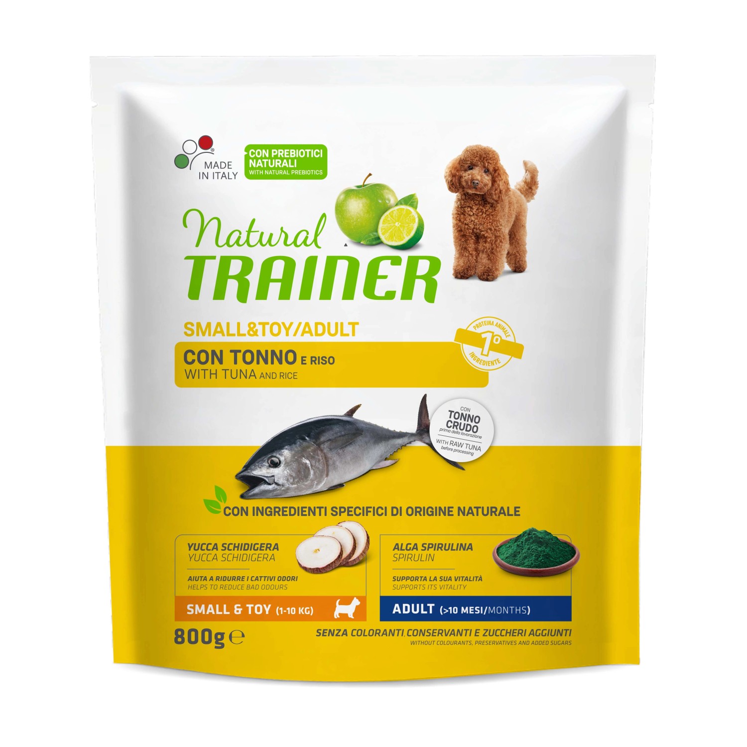 Natural Trainer Adult Small & Toy con Tonno crocchette per cani adulti di taglia piccola e toy, con vitamina C e ingredienti di ottima qualità, per mantenere la perfetta forma fisica del tuo amico a quattro zampe. La azione rivitalizzante e rigenerante dei principi nutritivi dell`Alga spirulina, insieme con proteine, vitamine e minerali, aiuta a supportare la vitalità dell`organismo. Le naturali proprietà dell`estratto di Yucca contribuiscono a ridurre l`odore delle feci, aiutando a limitare le fermentazioni proteiche intestinali. La forma speciale di Vitamina C aiuta a prevenire la formazione di tartaro e alito cattivo.