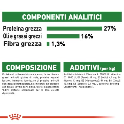 Inoltre, ROYAL CANIN® Mini Adult è arricchito con sostanze nutritive che contribuiscono alla salute della pelle e del pelo del tuo cane. Contiene EPA- DHA, acidi grassi essenziali omega-3, che aiutano anche a mantenere la salute di ossa e articolazioni.