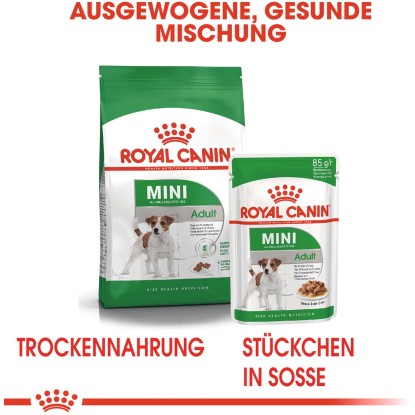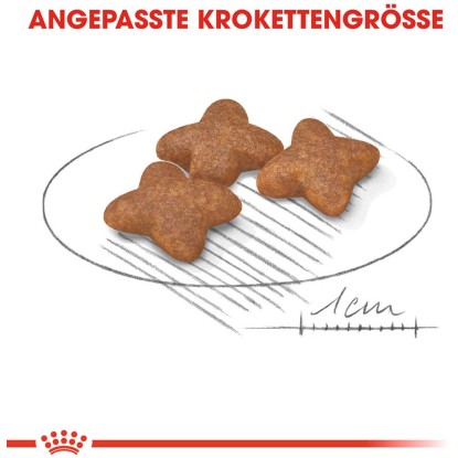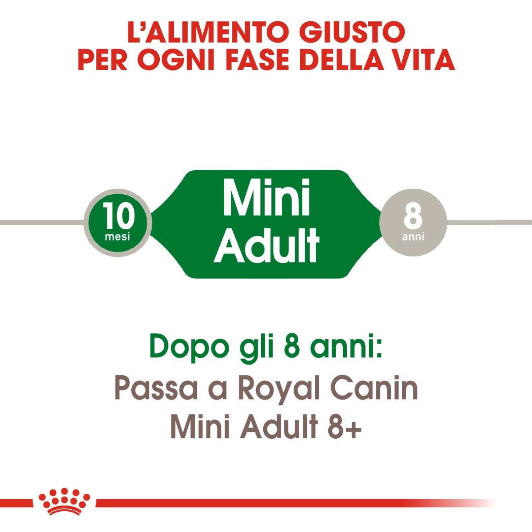 ROYAL CANIN® Mini Adult è stato appositamente formulato per soddisfare le esigenze nutrizionali del tuo cane adulto di taglia piccola (fino a 10 kg di peso) dall'età di 10 mesi fino ai 8 anni. Questo alimento, grazie al contenuto adattato di nutrienti specifici, aiuta i cani di piccola taglia a mantenere il peso ideale. È arricchito con L-Carnitina che favorisce un sano metabolismo dei grassi.