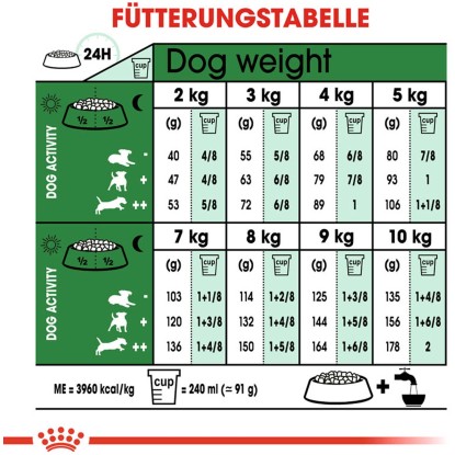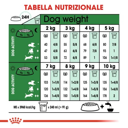 Attività normale: 2kg: 47g, 3kg: 63g, 4kg: 79g, 5kg: 93g, 7kg: 120g, 8kg: 132g, 9kg: 144g, 10kg: 156g