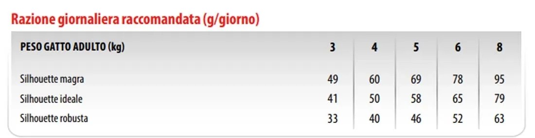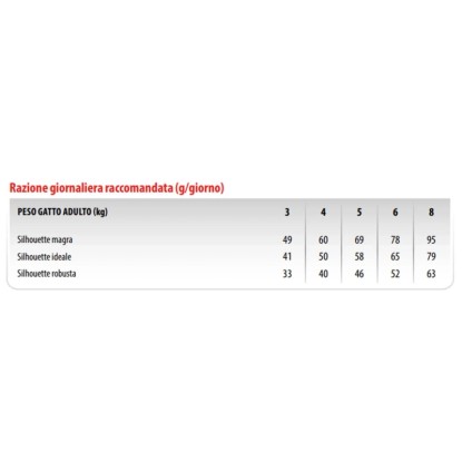 Le quantità possono essere adattate a seconda della taglia, attività fisica e delle condizioni di vita dell'animale. La razione giornaliera raccomandata indicata in tabella può essere suddivisa in 2 pasti giornalieri.