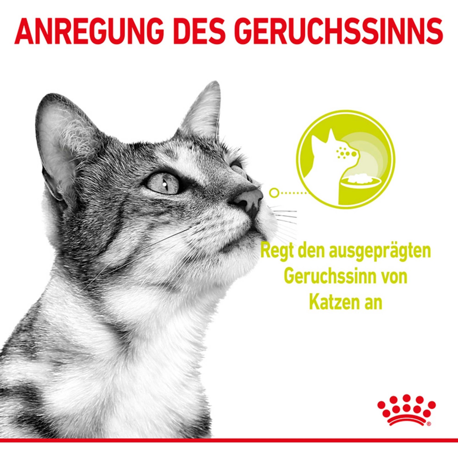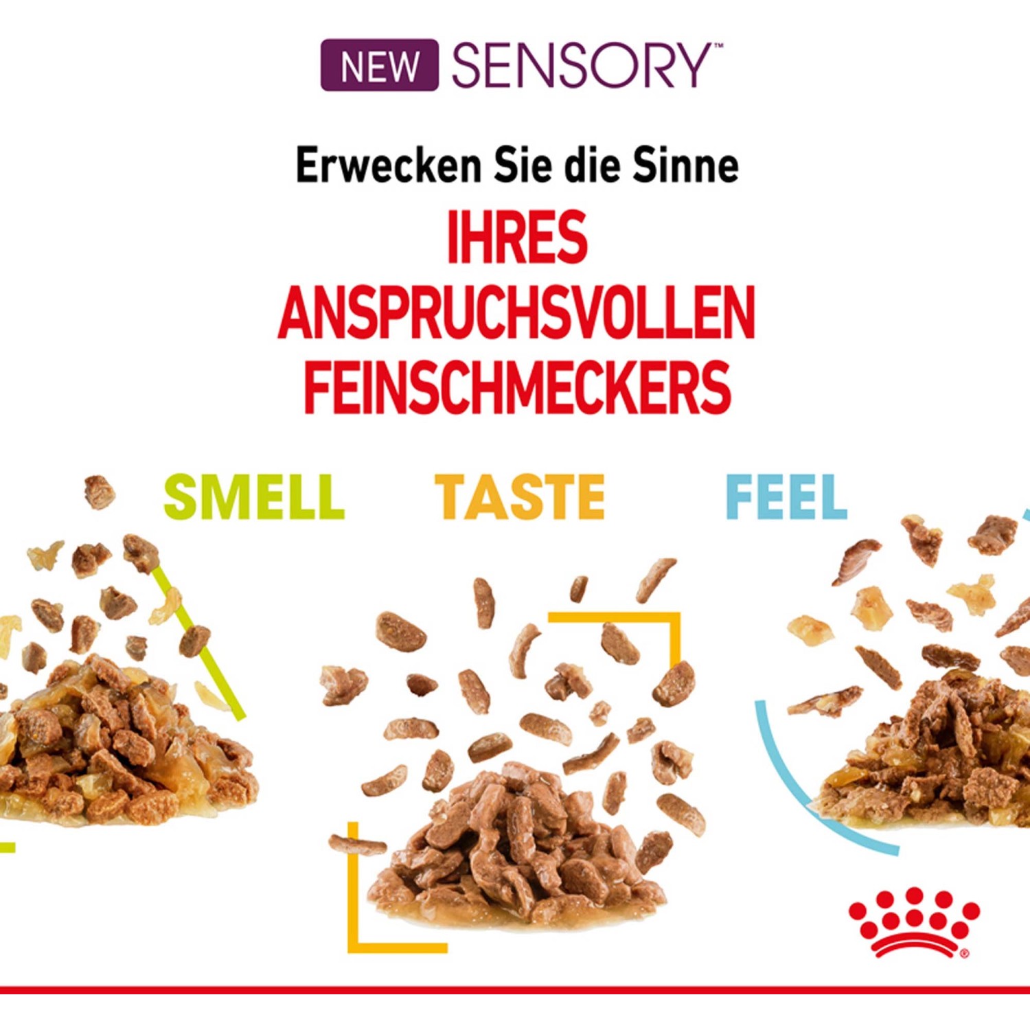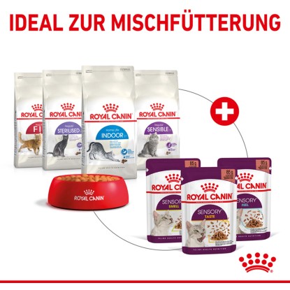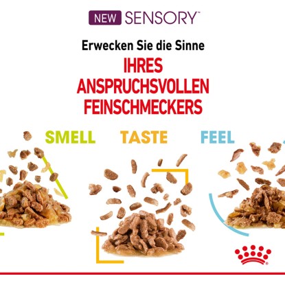 Il senso dell`olfatto dei gatti è molto più sviluppato rispetto a quello degli esseri umani. Le ricette Sensory Smell di Royal Canin sono state formulate con un profilo olfattivo di pesce sostenibile, caratterizzato da componenti di odori grassi, fruttati e nocciolati. Questi odori sono particolarmente attraenti per l`olfatto dei gatti e stimolano la loro curiosità.