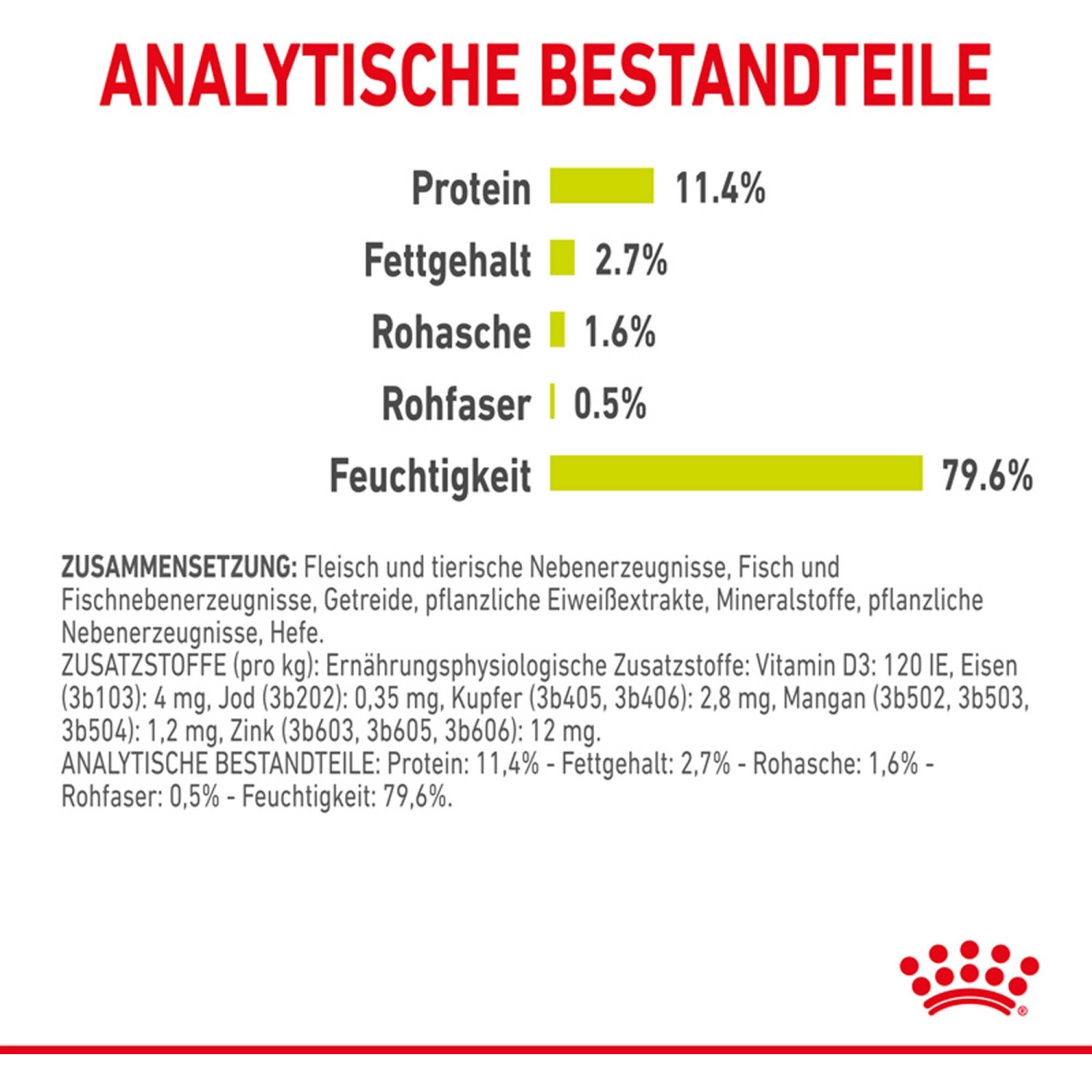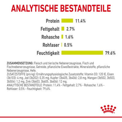 La composizione del cibo umido include carne e sottoprodotti di origine animale, pesce e frattaglie di pesce, cereali, estratti proteici vegetali, minerali, sottoprodotti vegetali e lievito.