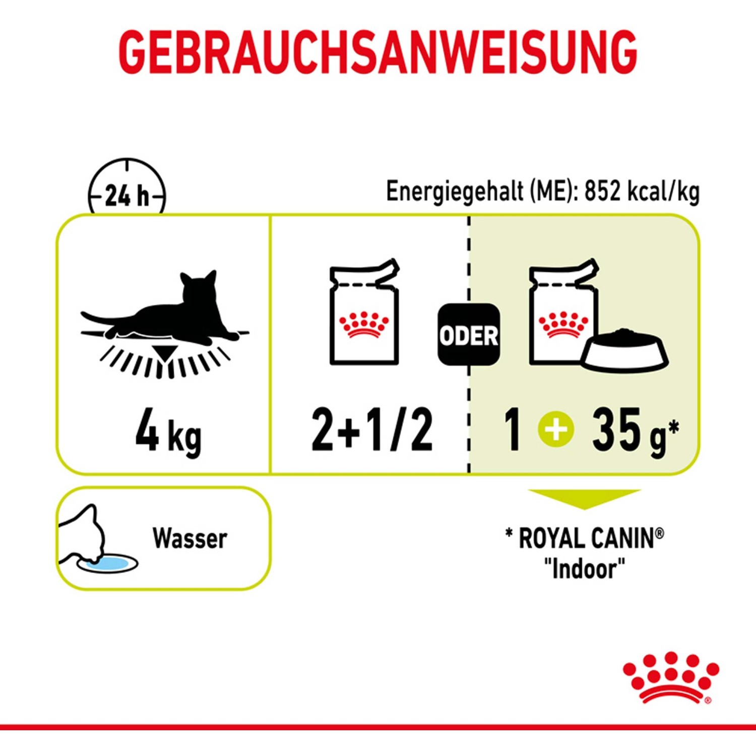 La quantità di cibo raccomandata varia in base al peso del tuo gatto. La guida approssimativa per un gatto da 4 kg è di 2 e 1/2 sacchetti freschi al giorno oppure 1 sacchetto fresco + 35g di mangime essiccato.