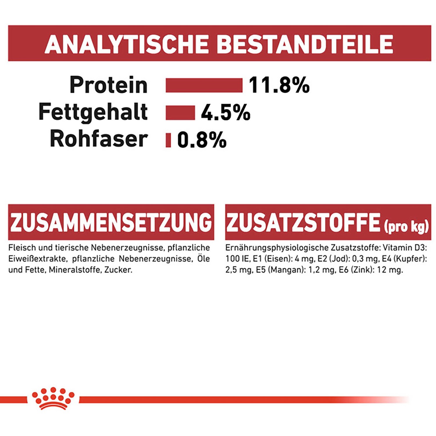 Composizione: Carni e derivati, Estratti di proteine vegetali, Sottoprodotti di origine vegetale, Oli e grassi, Sali minerali, Zuccheri