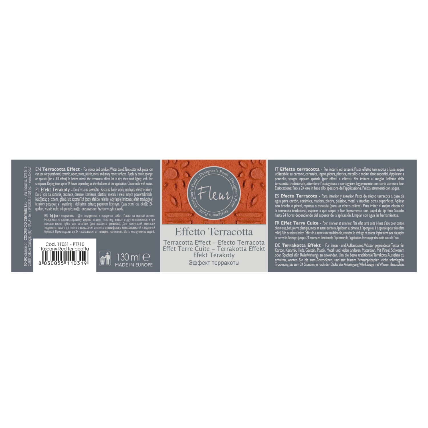 La pasta a rilievo Fleaur specials effetto terracotta è una soluzione a base acqua che può essere utilizzata su qualsiasi tipo di superficie, sia all`interno che all`esterno. Si applica facilmente con pennello, spugna o spatola (quest`ultima è particolarmente indicata per ottenere effetti a rilievo). Per ottenere un risultato simile alla terracotta tradizionale, è consigliabile attendere che la pasta si asciughi e poi carteggiarla leggermente con carta abrasiva fine.