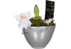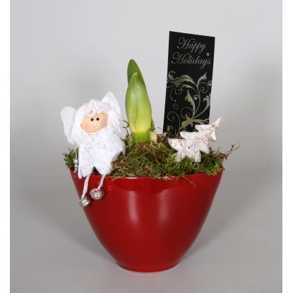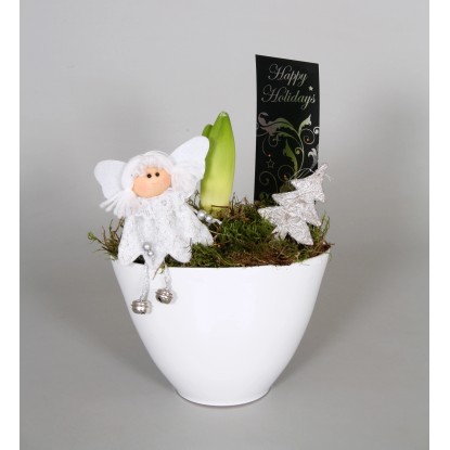 L`affascinante composizione è composta da un amaryllis e un vaso in ceramica del quale è possibile scegliere il colore tra bianco, color argento o rosso del diametro di 14 cm ed è decorata con muschio e un simpatico angioletto.