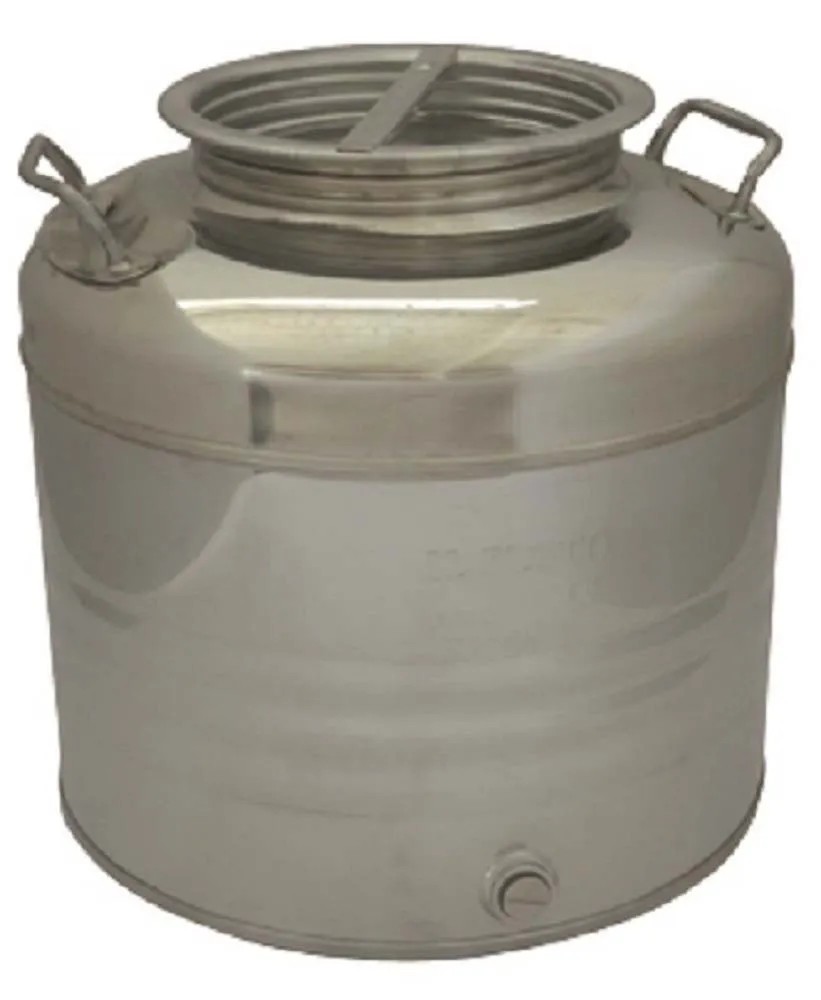 Contenitore per olio. Fusto graffato 30 lt in acciaio inox certificato per alimenti. Con manici e chiusura ermetica con tappo a vite del diametro di 200 mm. Predisposto per il rubinetto. Utlizzato per olio e per altri liquidi