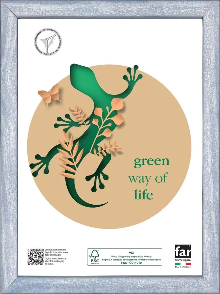 La cornice in legno certificato GARCIA caratterizzata da delicate e frizzanti tinte pastello è l`articolo ideale per contenere i vostri ricordi più preziosi o le vostre stampe nel formato 21x29,7 (A4) cm. La finitura ad effetto gesso si adatta perfettamente ad ogni ambiente, e il tono azzurro è un richiamo al mare. Il frontale in vetro trasparente garantirà al ricordo la miglior conservazione possibile. Comodamente appendibile in senso verticale o orizzontale in base alle esigenze.