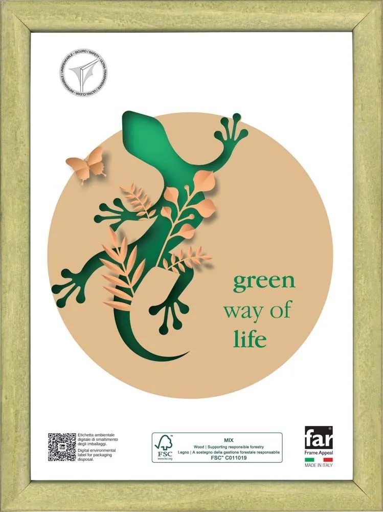La cornice in legno certificato GARCIA caratterizzata da delicate e frizzanti tinte pastello è l`articolo ideale per contenere i vostri ricordi più preziosi o le vostre stampe nel formato 40x50 cm. La finitura ad effetto gesso si adatta perfettamente ad ogni ambiente, e il tono verde è un richiamo alla natura. Il frontale in vetro trasparente garantirà al ricordo la miglior conservazione possibile. Comodamente appendibile in senso verticale o orizzontale in base alle esigenze.