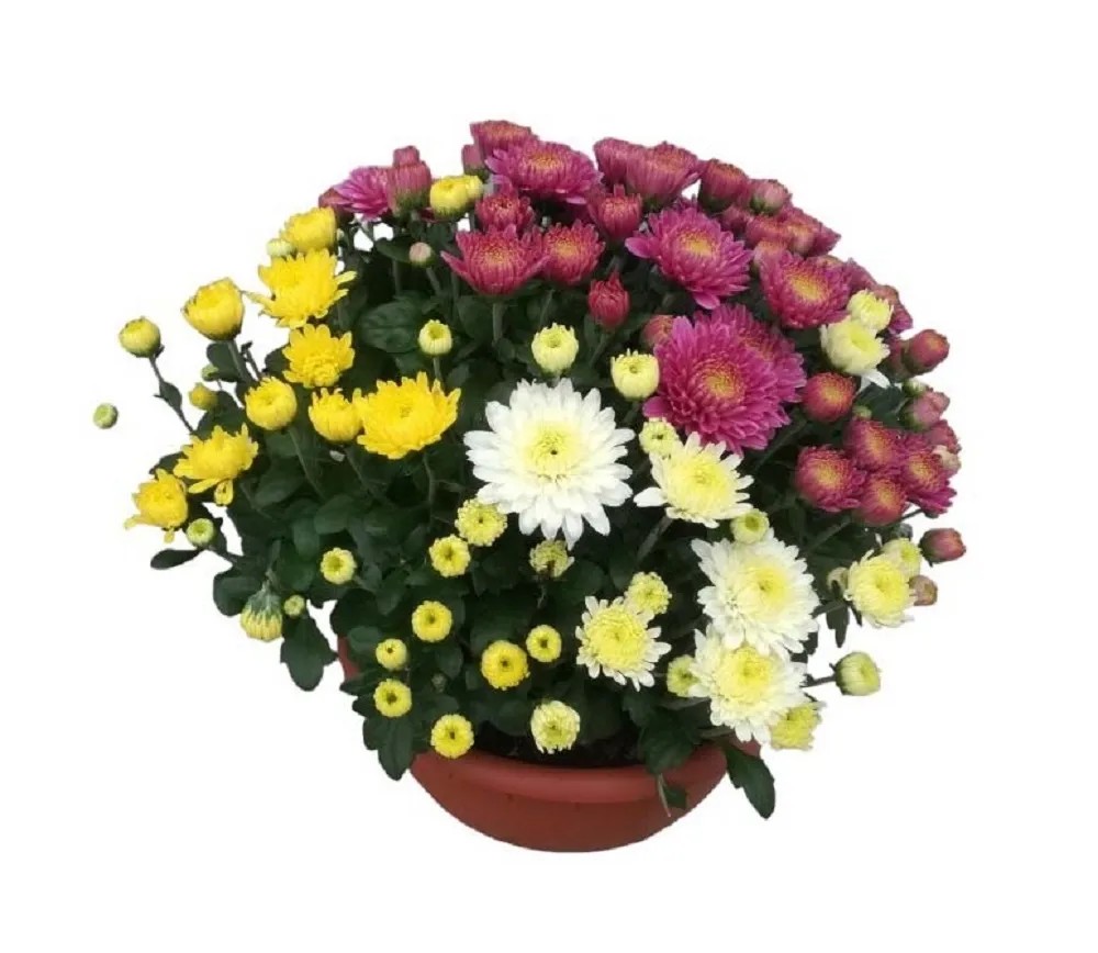 Crisantemo a fiore piccolo tricolore e monocolore coltivato in una ciotola dm.20 ideale per abbellire i giardini