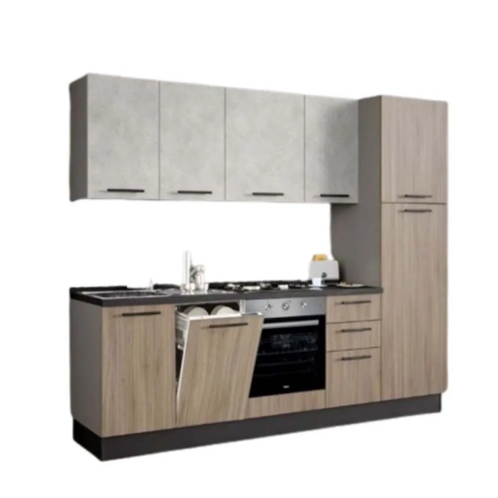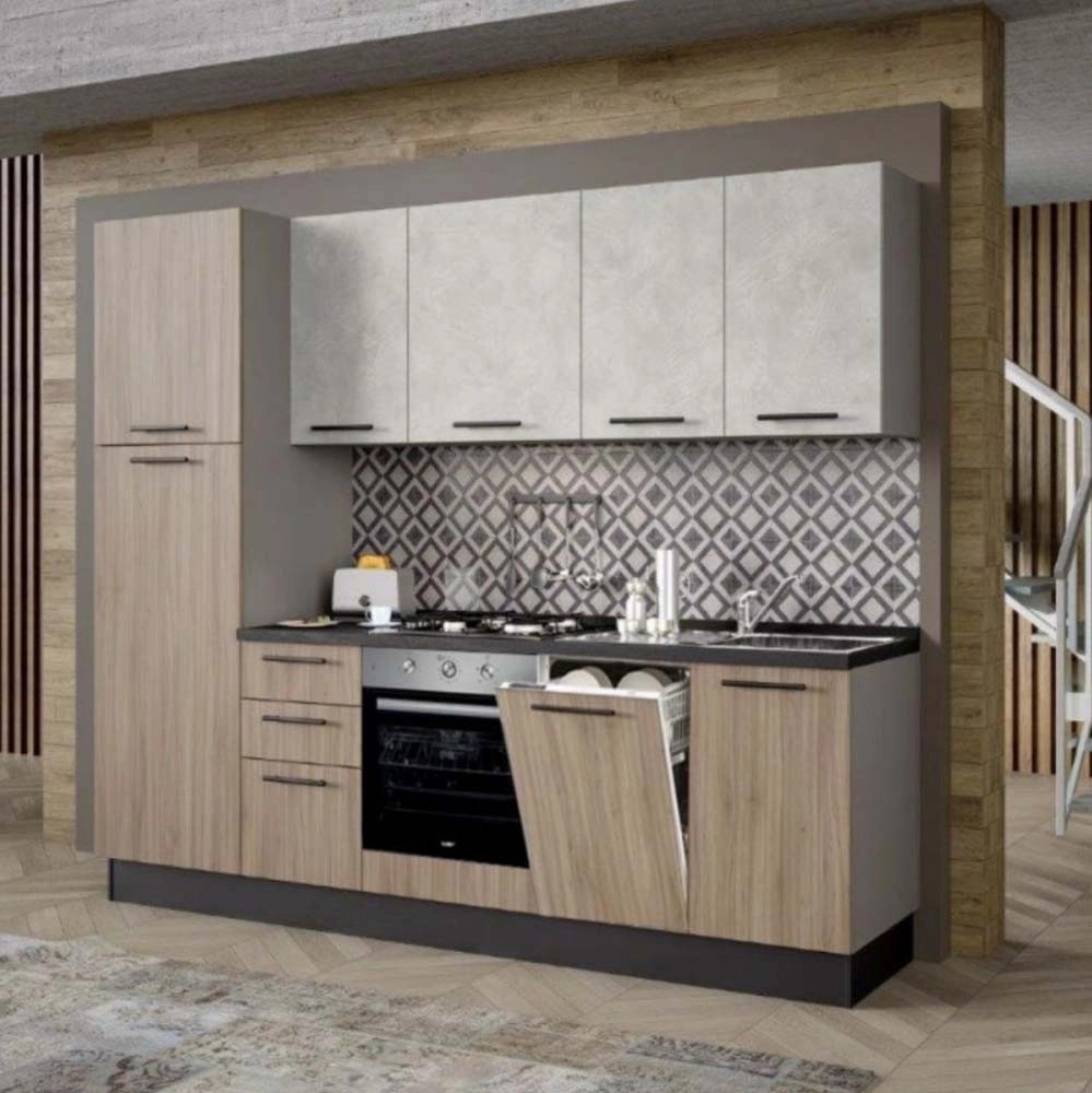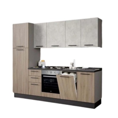 La cucina Licola 255 cm in finitura rovere è una soluzione completa e già equipaggiata con tutti gli elettrodomestici indispensabili, ideale per chi cerca praticità, estetica e qualità Made in Italy. Grazie alla struttura lineare e reversibile, si adatta perfettamente a qualsiasi ambiente domestico, anche spazi ridotti o cucine secondarie. Materiali resistenti, design moderno e componenti preassemblati permettono un'installazione semplice e rapida.