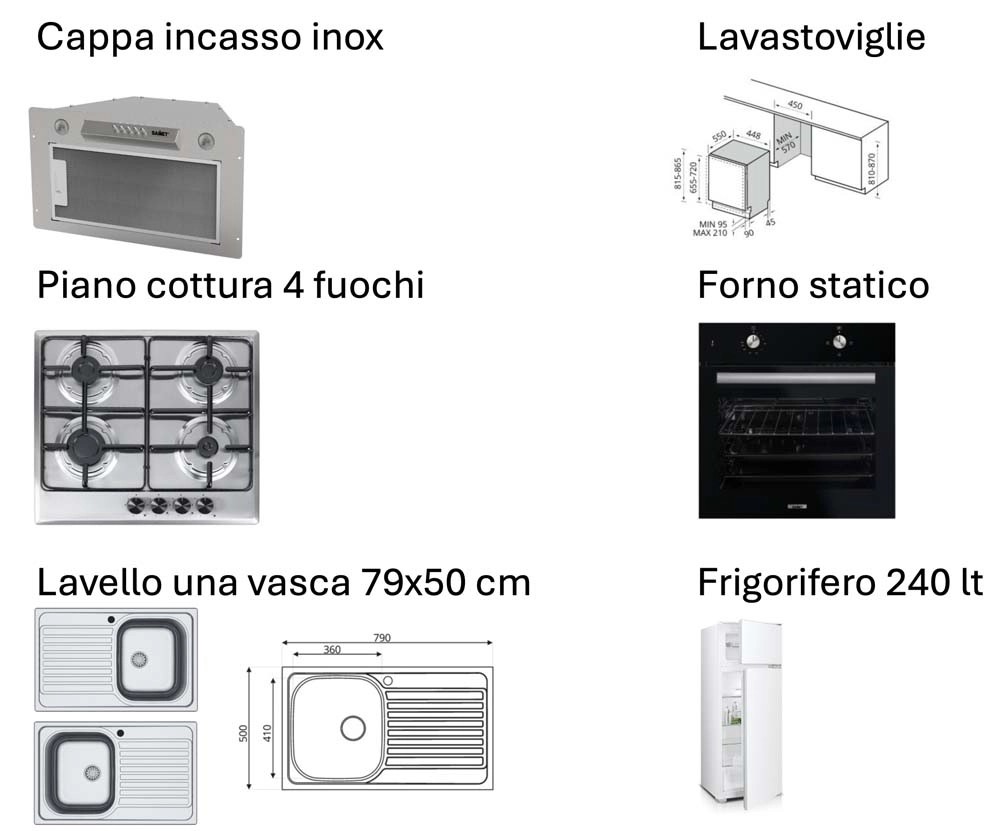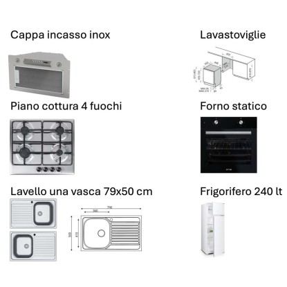 cappa a incasso inox, piano cottura inox 4 fuochi a gas, forno statico Lamona LAM3210, lavastoviglie da incasso, frigorifero 240 litri e lavello inox 79x50 cm reversibile.