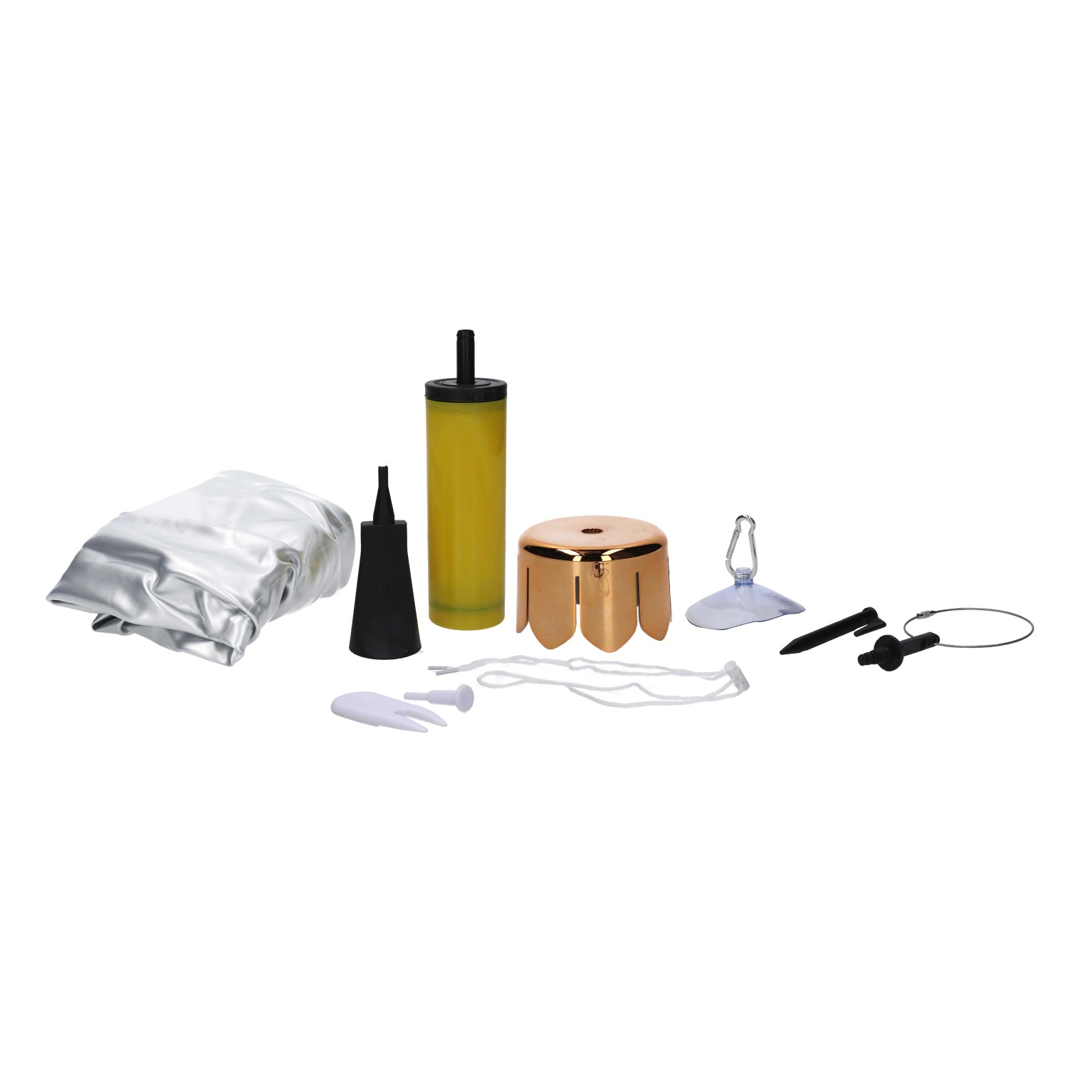 La confezione comprende: sfera in PVC, tappo per appendere, top in plastica, picchetti da terra, corda, ventosa e pompa per il gonfiaggio.