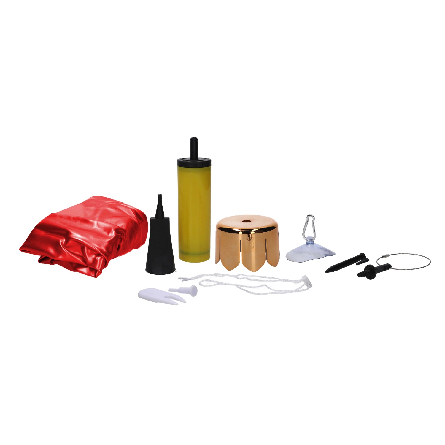 La confezione comprende: sfera in PVC, tappo per appendere, top in plastica, picchetti da terra, corda, ventosa e pompa per il gonfiaggio.