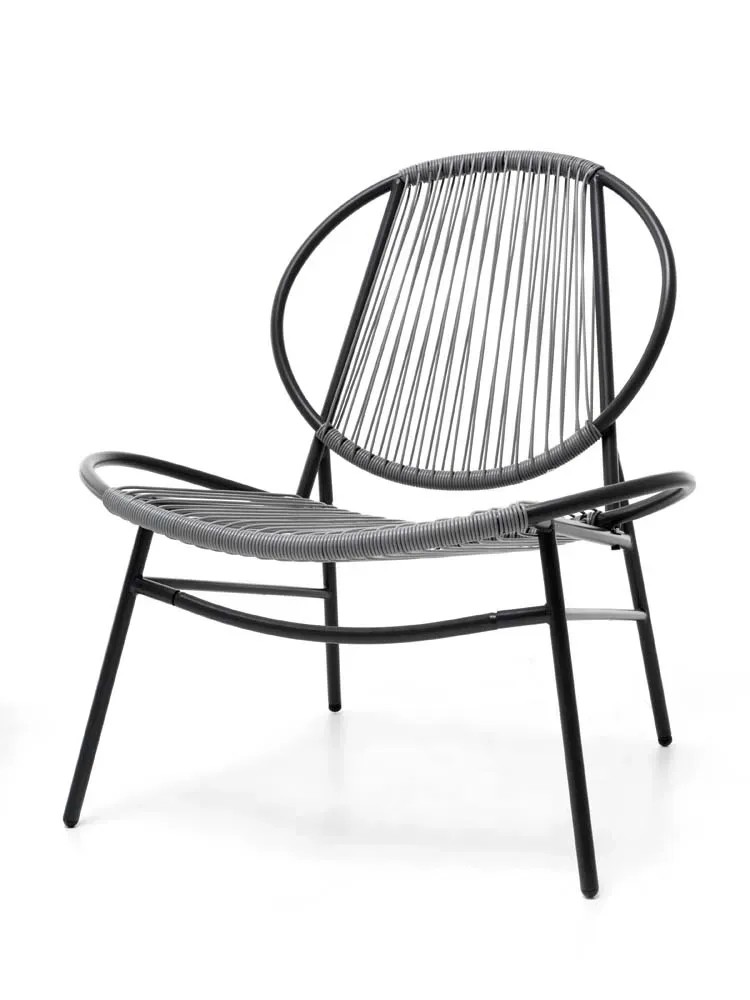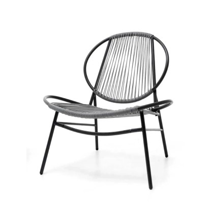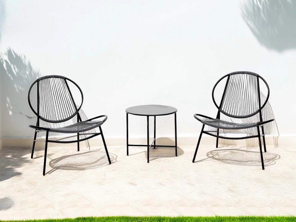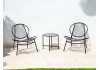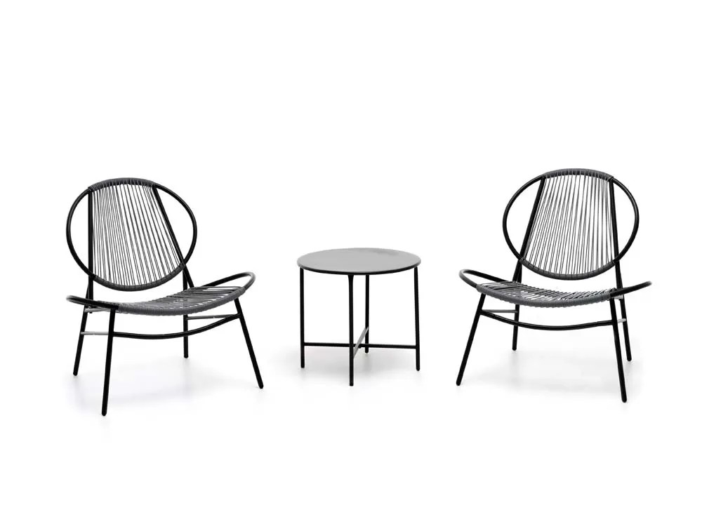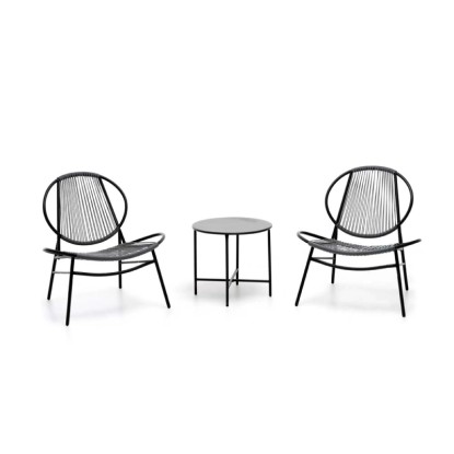 Set Bistrot composto da 2 poltroncine ed 1 tavolino da caffè. Struttura in ferro verniciato a polvere epossidica di colore antracite, poltrone rivestite da intreccio in fibre di polyrattan con sezione tonda 3 mm, tavolino da caffè in ferro verniciato a polvere epossidica di colore antracite. Dim.: Tavolo Ø 50xH45cm; Sedia 68x74xH78cm