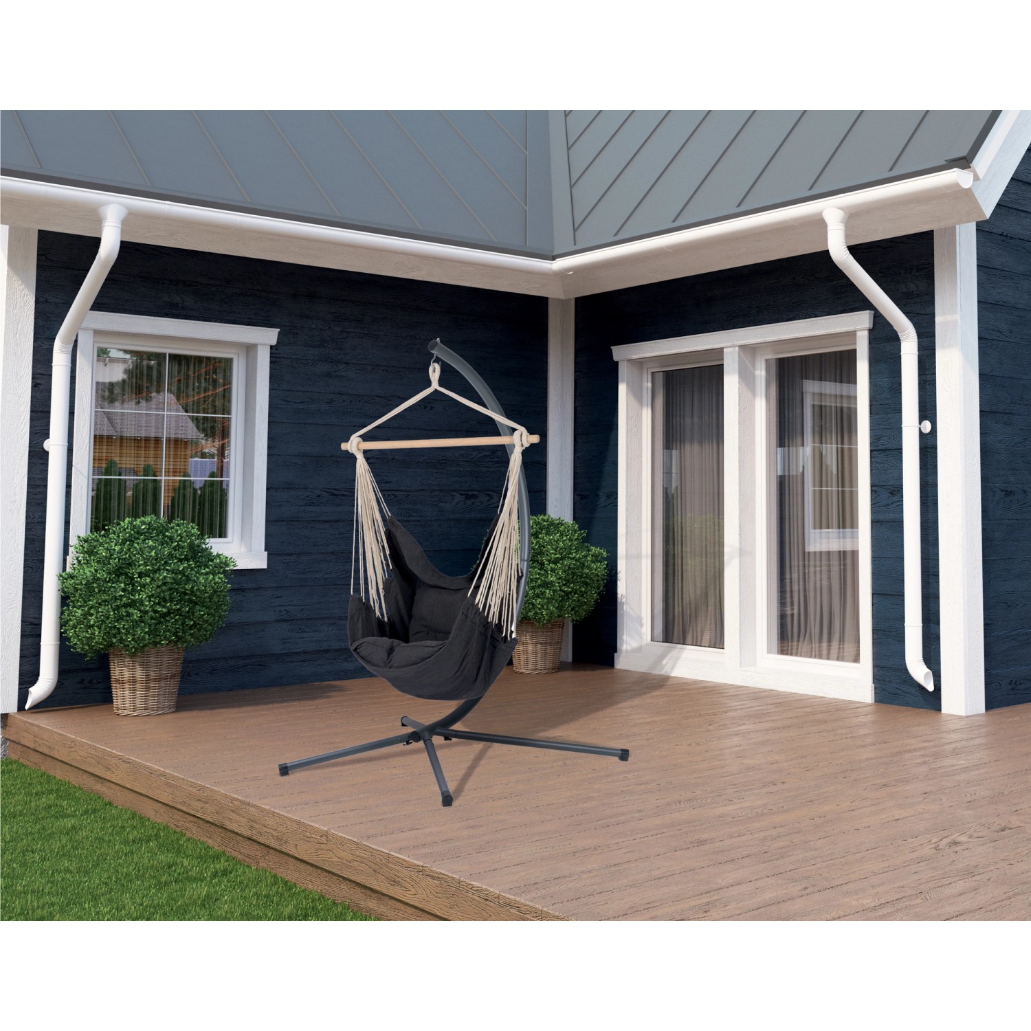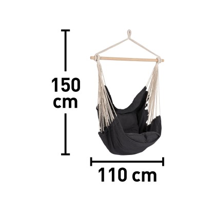 L'amaca in cotone antracite 150x110 cm offre comfort e stile per il tuo giardino, completata da un cuscino incluso per una seduta ancora più piacevole.