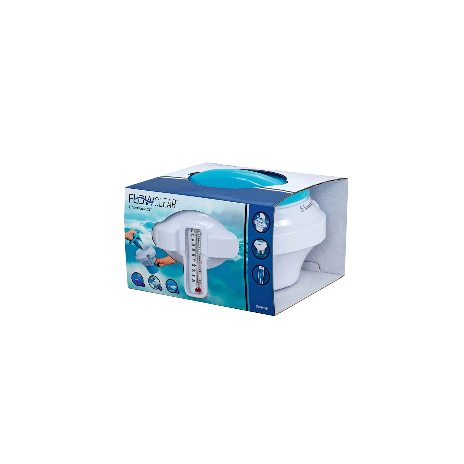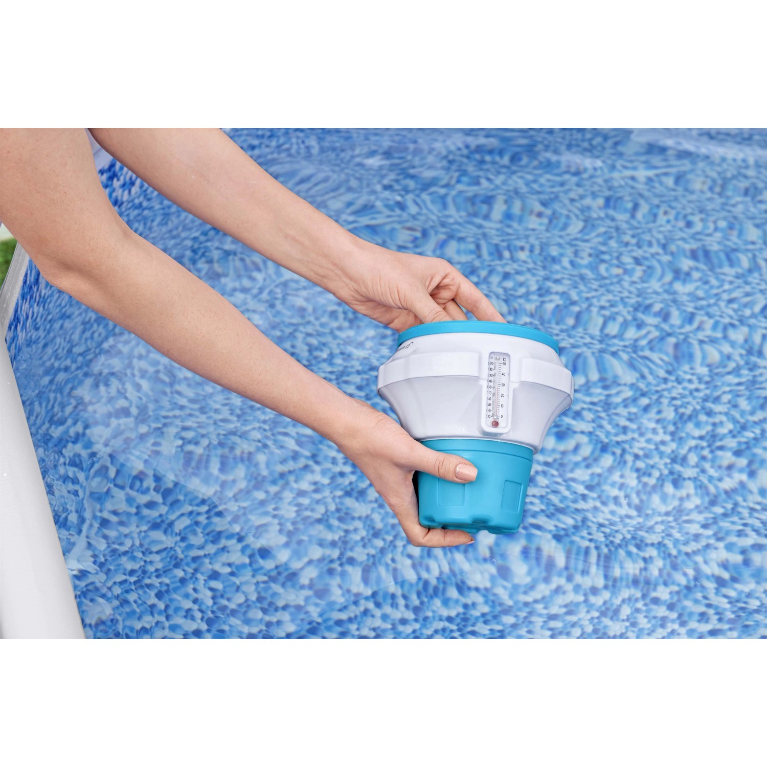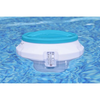 La presenza di qualsiasi tipo di prodotto chimico sulle mani può causare irritazioni e macchie sulla pelle. Il coperchio di ChemGuard può essere utilizzato come guanto protettivo per maneggiare le pastiglie in tutta sicurezza, con anche la tranquillità di sapere che la chiusura a doppia azione, a prova di bambino, manterrà i prodotti chimici ben lontani dalle mani dei più piccoli. È sufficiente aggiungere le pastiglie di cloro o bromo (non incluse), fino a 7,6 cm, e posizionare il dosatore galleggiante in acqua, dove comincerà a disperdere la quantità prestabilita di cloro nella vasca. Non sei sicuro dei dosaggi? Utilizza la manopola regolabile per controllare il rilascio in base alle dimensioni della tua piscina e otterrai sempre la quantità giusta! Il galleggiante integra anche un termometro (quindi incluso) che consente di leggere facilmente la temperatura in gradi Celsius e Fahrenheit prima di immergersi!