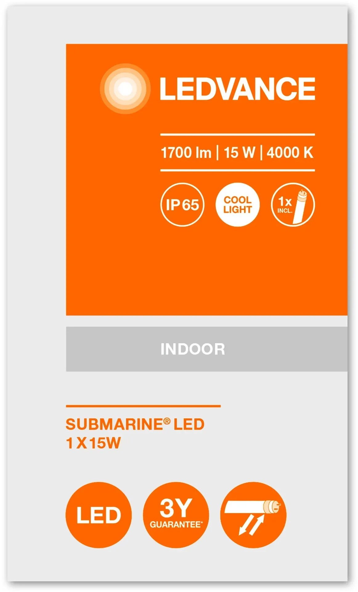 Submarine LED è una plafoniera stagna con tubo LED sostituibile SubstiTUBE modello T8 da 1,2 m, incluso nel prodotto. La plafoniera stagna, a funzionamento con l`alimentazione di rete, presenta un corpo in policarbonato ed è adatta per l`impiego in zone umide come scantinati e garage, erogando un flusso luminoso uniforme e di lunga durata. 17 W Grado di protezione: IP65.Durata: fino a 30.000 ore