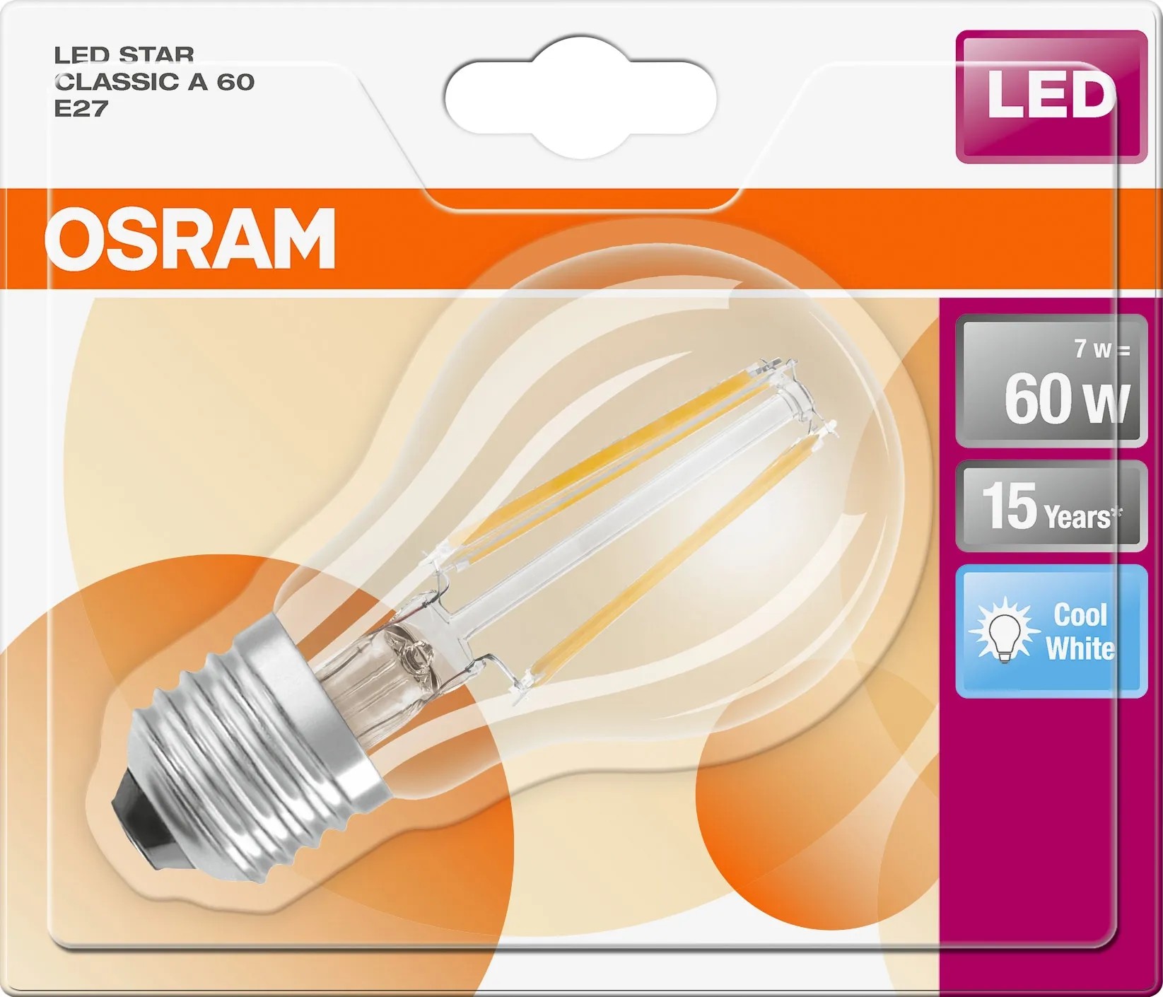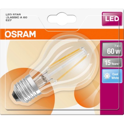 Lampadina LED Osram E27 a filamento con design tutto vetro e luce bianca neutra (4000 K). Ideale per ambienti moderni e per lampadari a vista, offre risparmio energetico e accensione immediata.