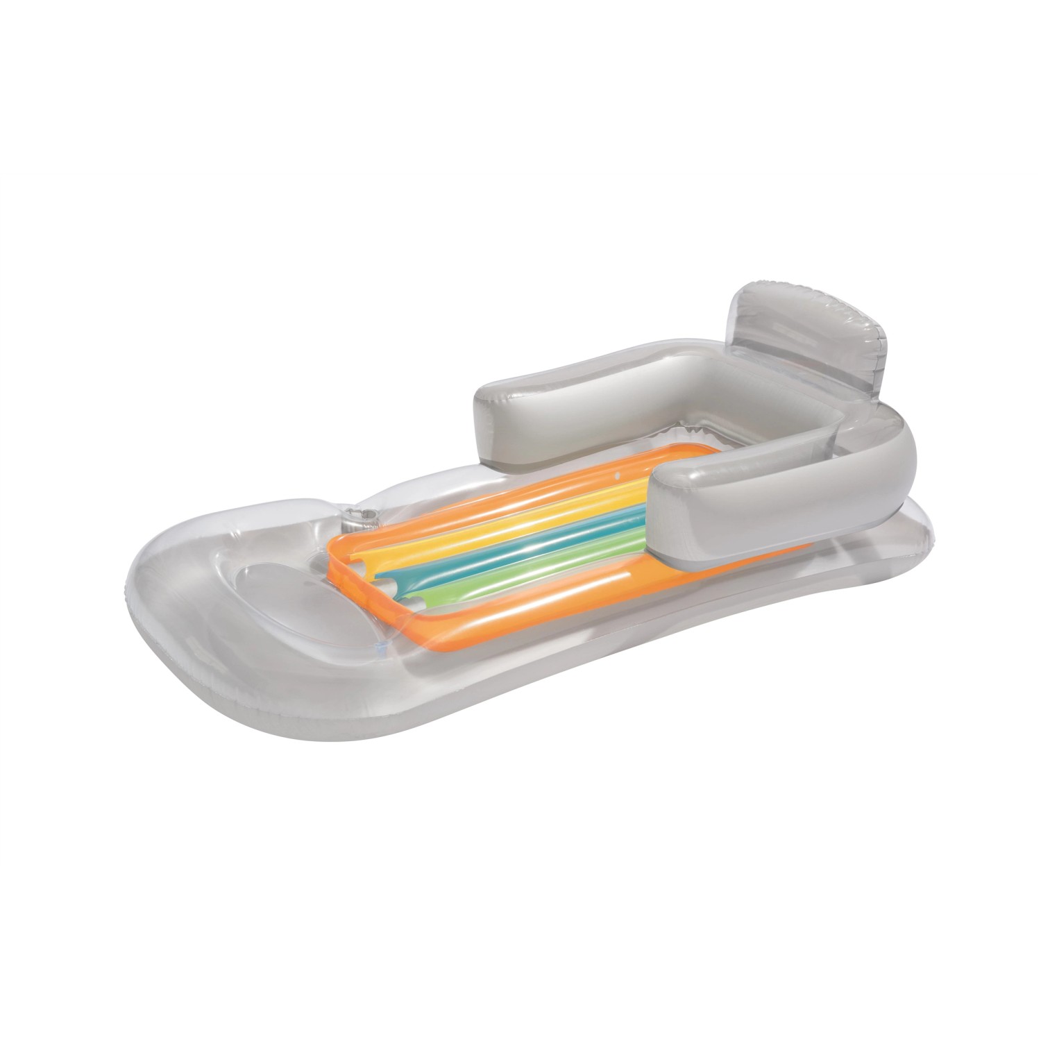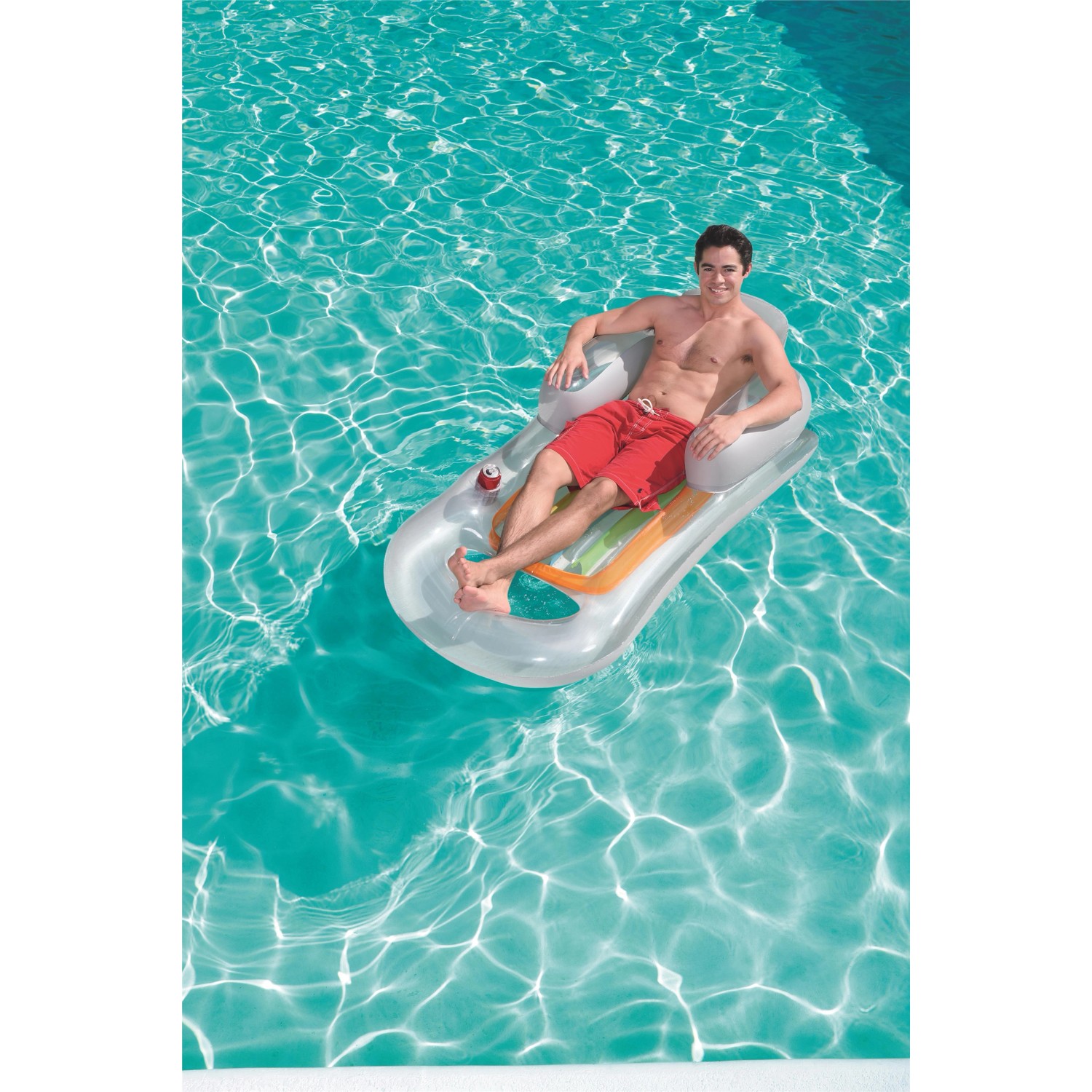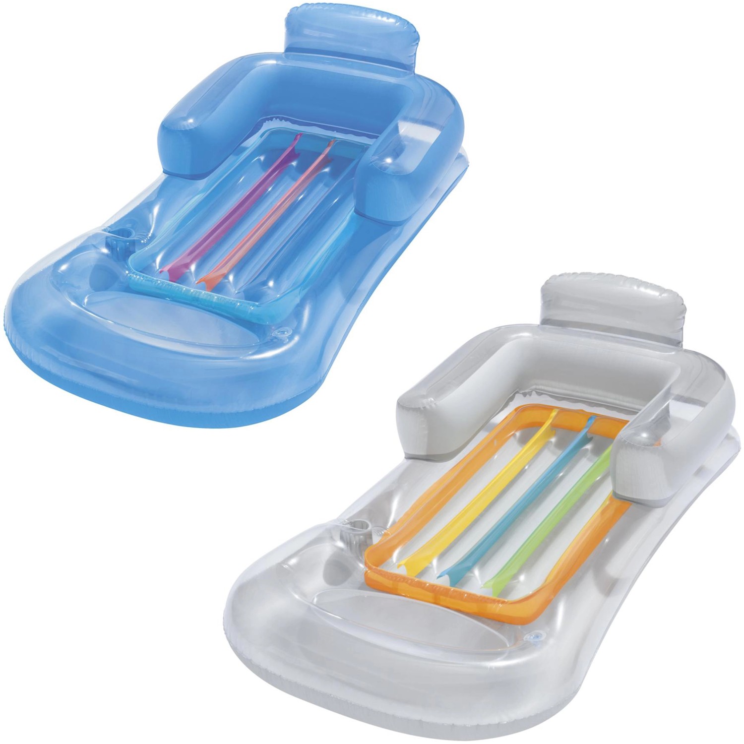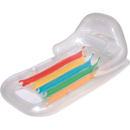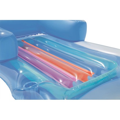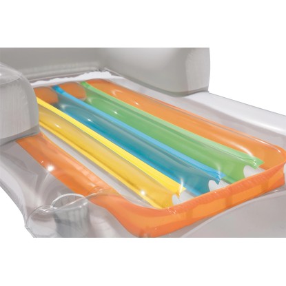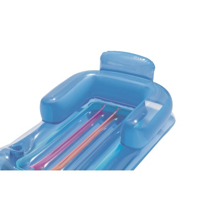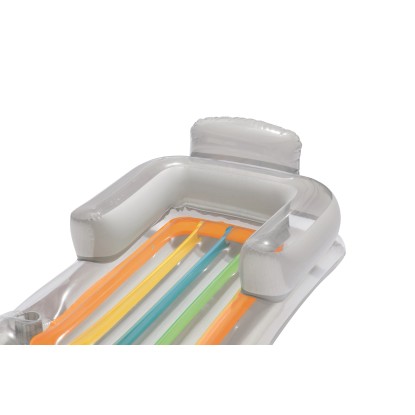 Materassino gonfiabile in pvc dotato di braccioli, poggiatesta e portabicchiere, con 2 camere d`aria. Contenuto della confezione: materassino e 1 patch di riparazione. Valvola di sicurezza e materiale in tessuto vinilico robusto pretestato. Dimensioni: 161 cm x 84 cm. Disponibile in 2 colori assortiti. Età: 8+