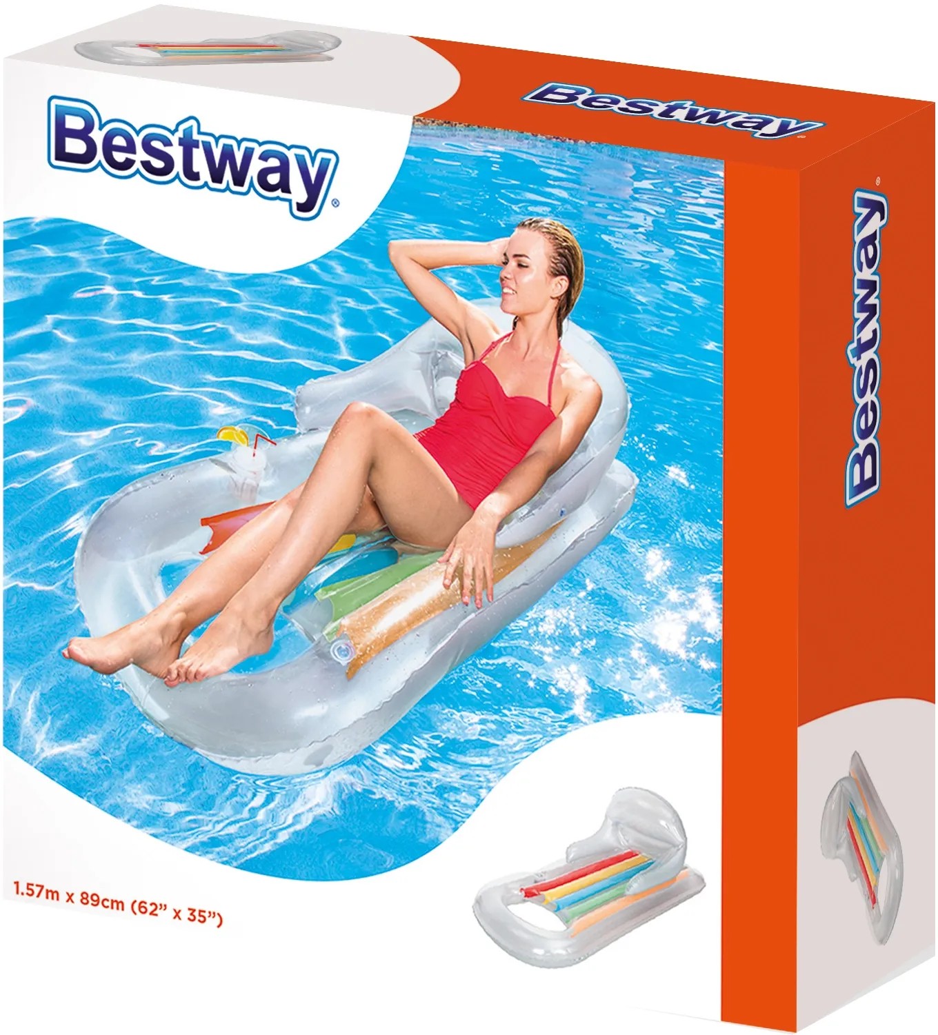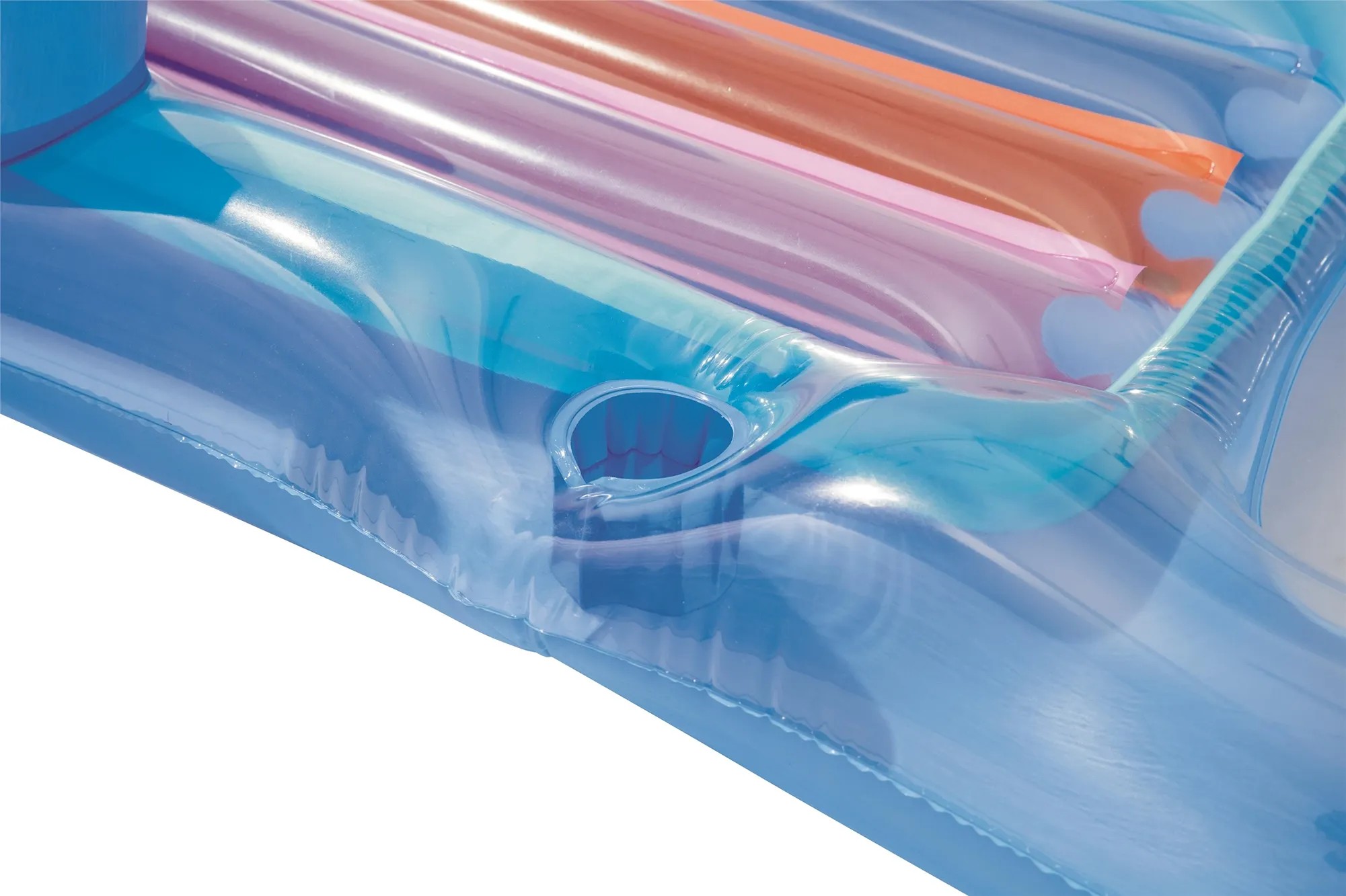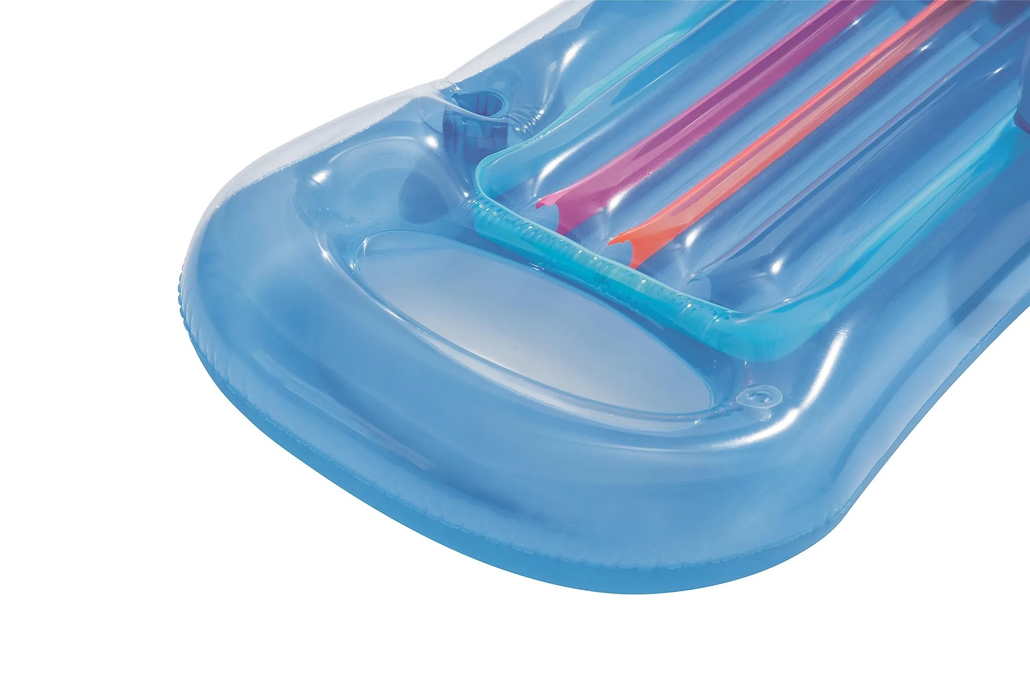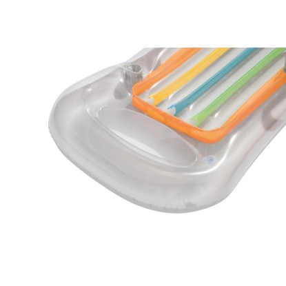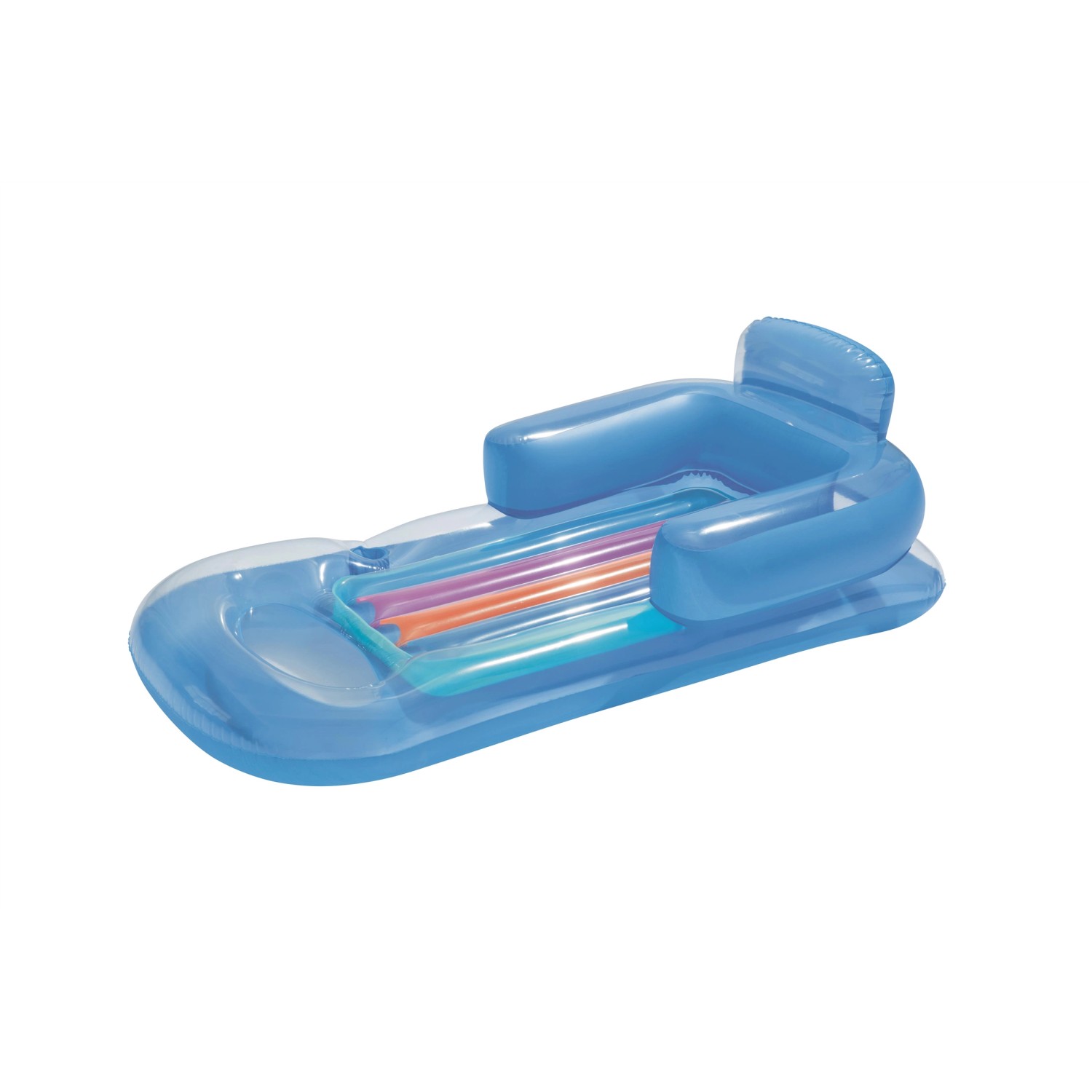 Materassino gonfiabile in pvc dotato di braccioli, poggiatesta e portabicchiere, con 2 camere d`aria. Contenuto della confezione: materassino e 1 patch di riparazione. Valvola di sicurezza e materiale in tessuto vinilico robusto pretestato. Dimensioni: 161 cm x 84 cm. Disponibile in 2 colori assortiti. Età: 8+