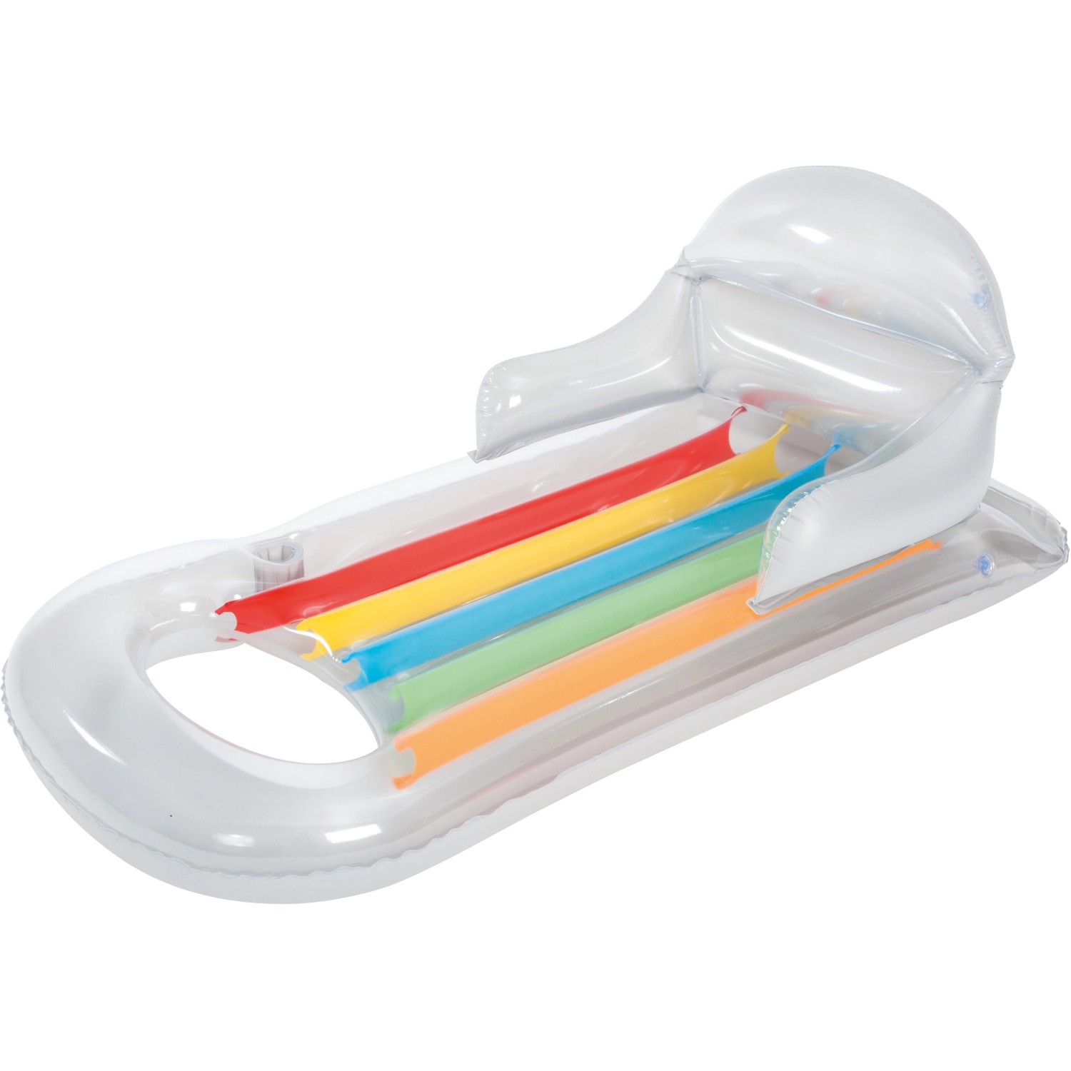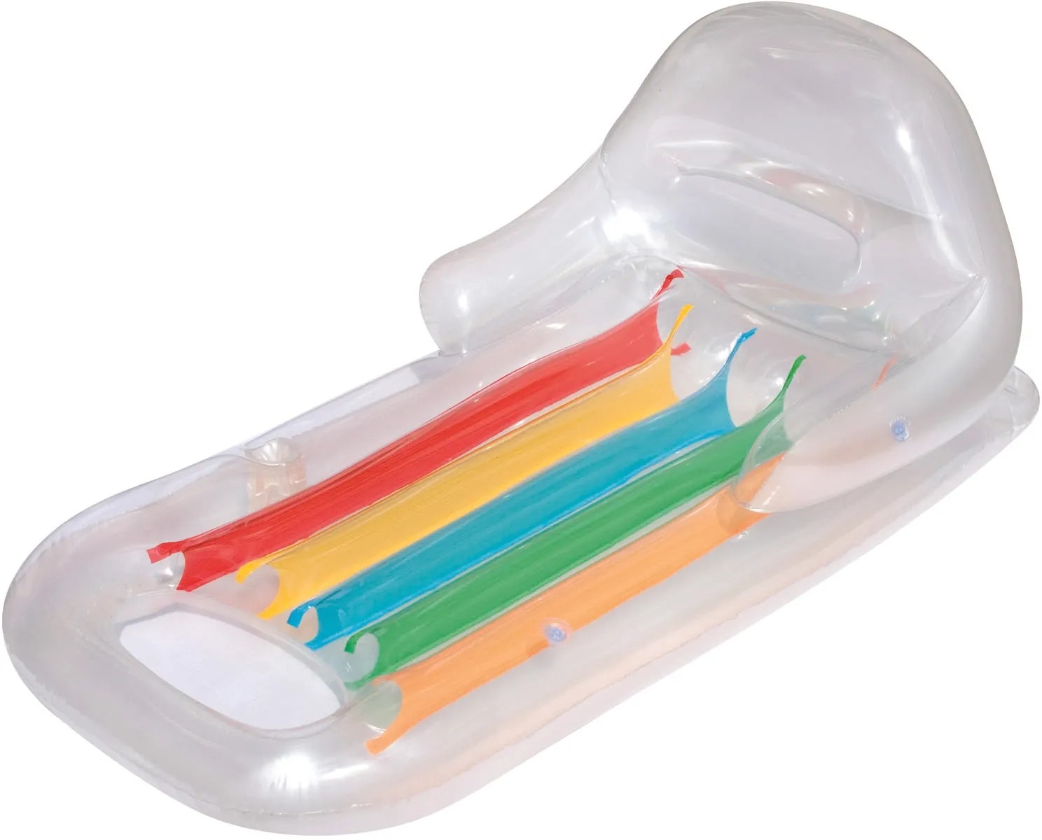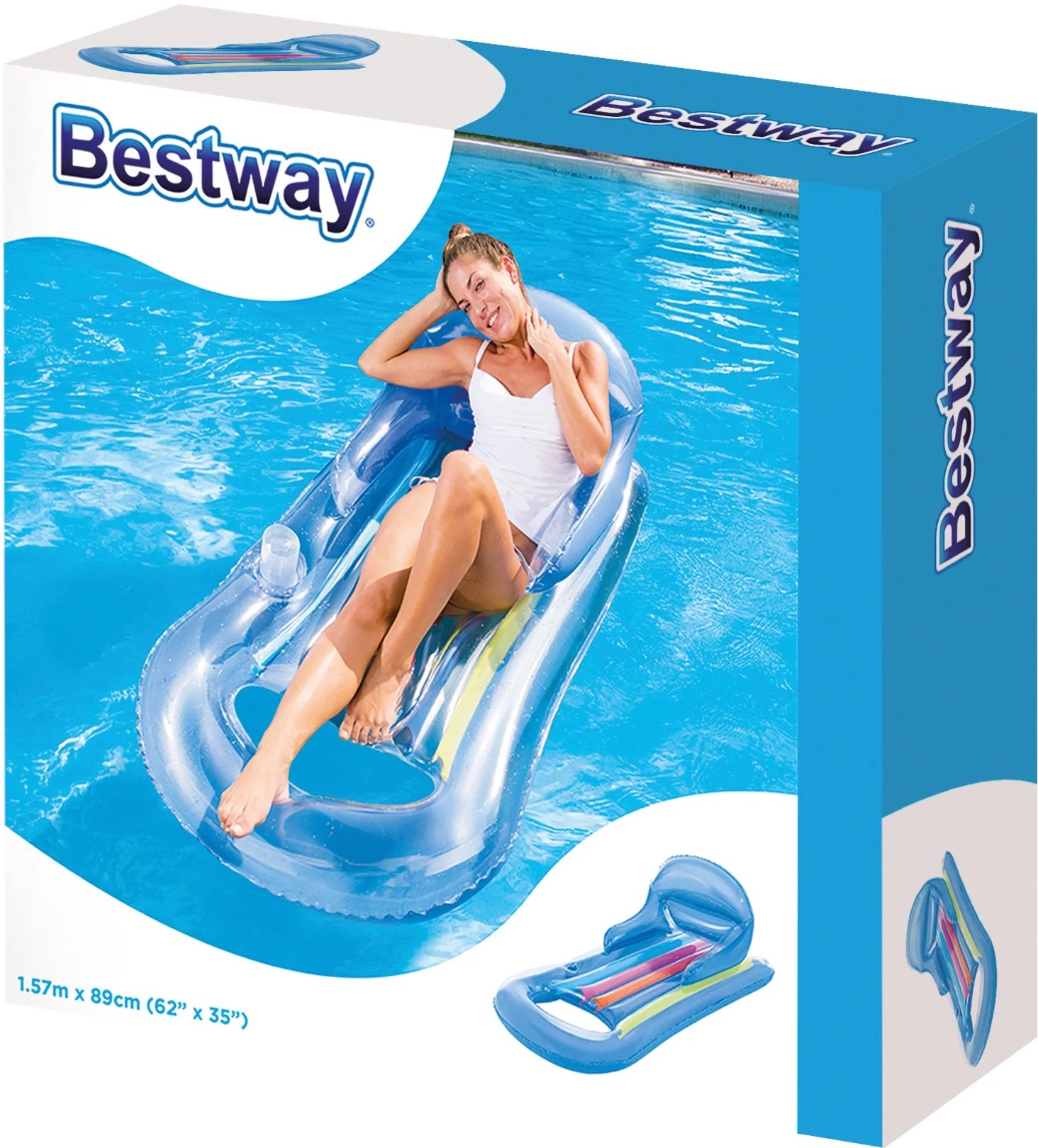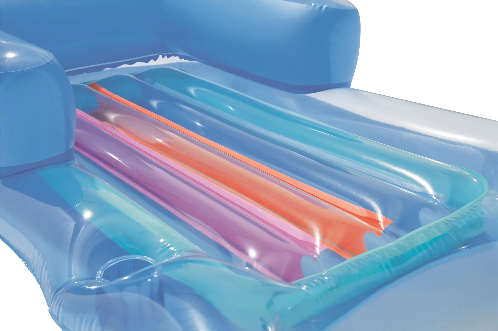 Materassino gonfiabile in pvc dotato di braccioli, poggiatesta e portabicchiere, con 2 camere d`aria. Contenuto della confezione: materassino e 1 patch di riparazione. Valvola di sicurezza e materiale in tessuto vinilico robusto pretestato. Dimensioni: 161 cm x 84 cm. Disponibile in 2 colori assortiti. Età: 8+