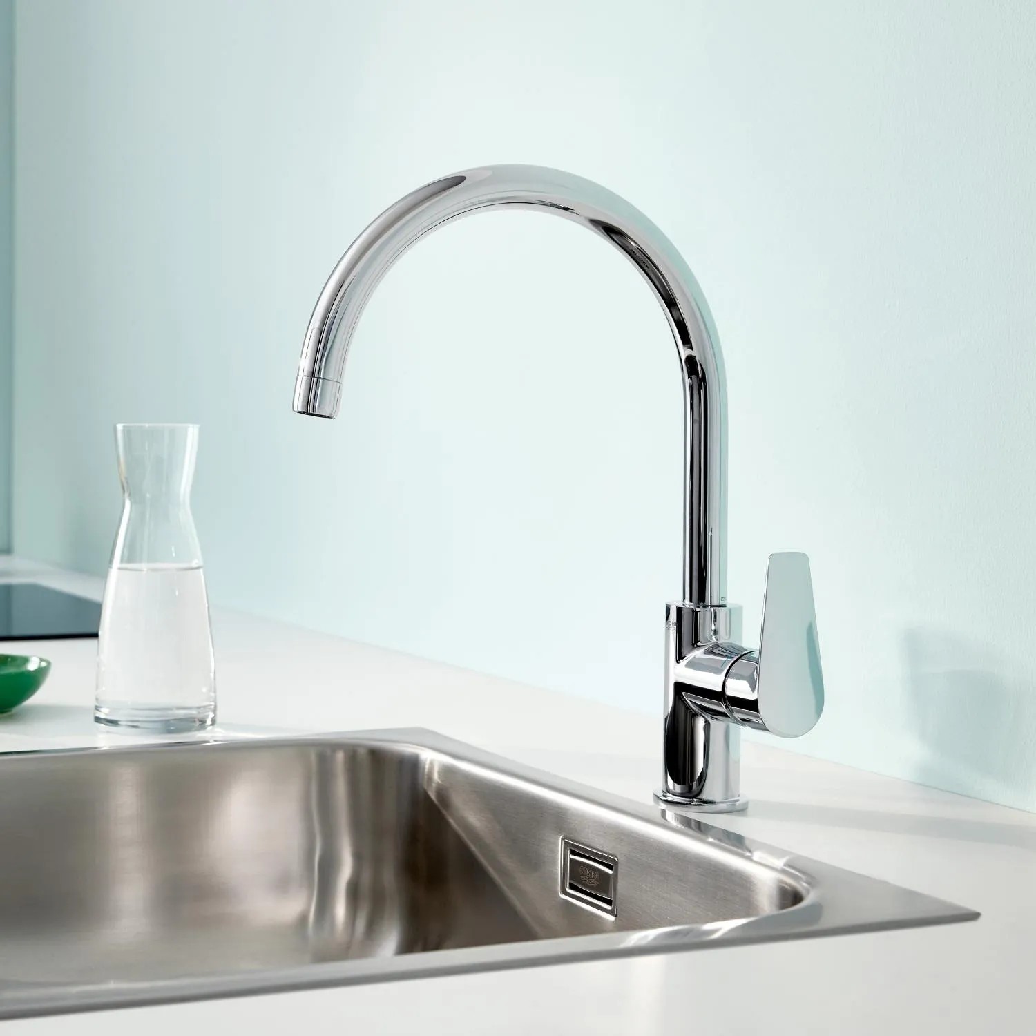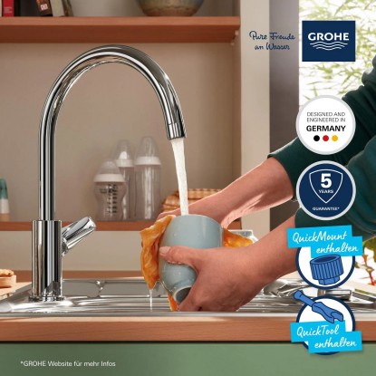 Il rubinetto monocomando per lavello Start Edge di Grohe unisce un design elegante e contemporaneo a massima facilità d`uso, rendendolo un elemento perfetto per qualsiasi cucina moderna.