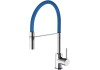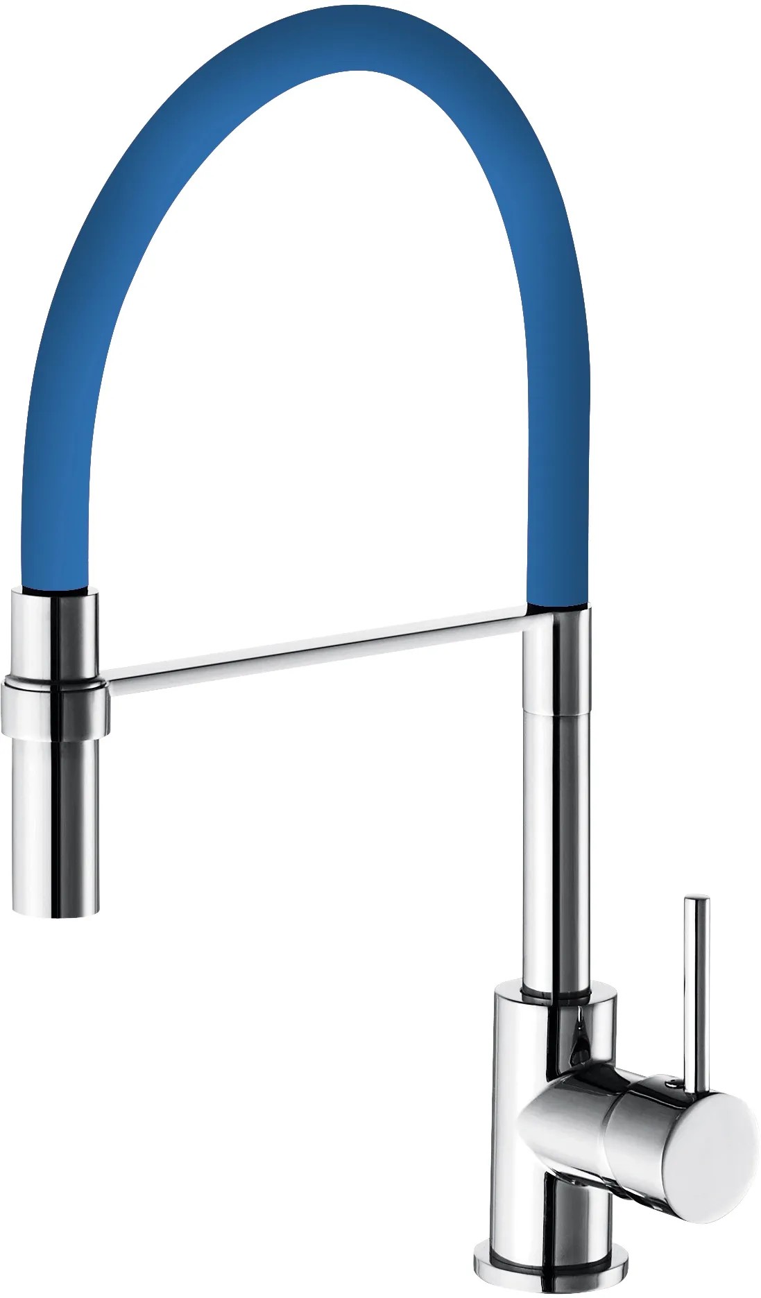 Miscelatore monocomando Winter a bocca alta per lavello, con doccetta monogetto orientabile in ottone. Dotato di una finitura cromata, un tubo in gomma blu, leva in metallo, cartuccia a dischi ceramici Ø 35 mm e flessibili inox.