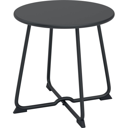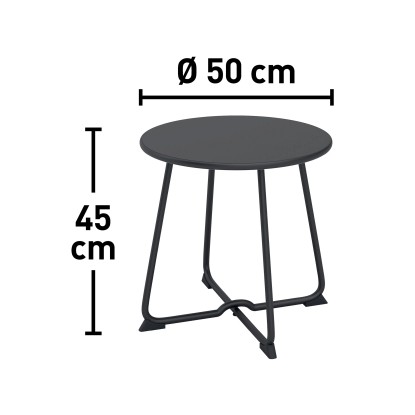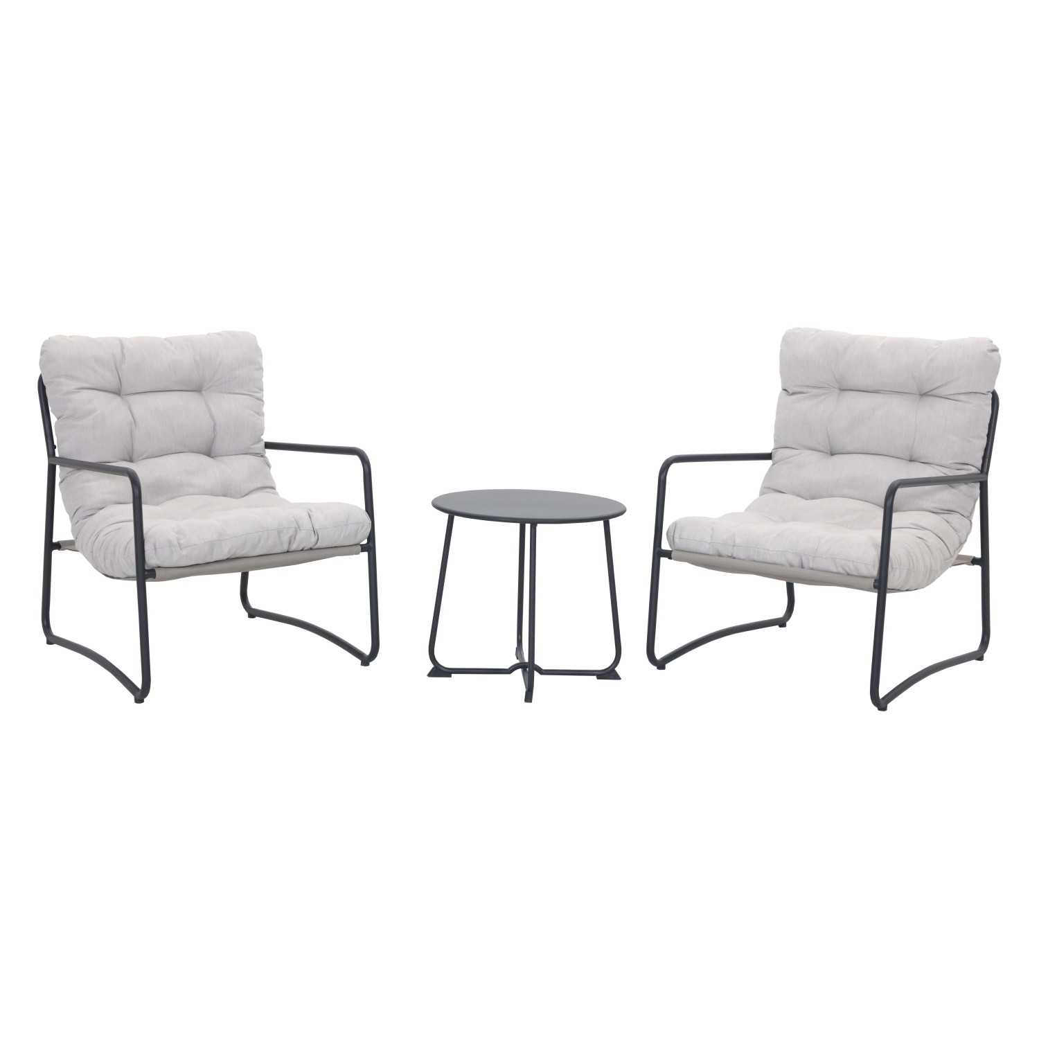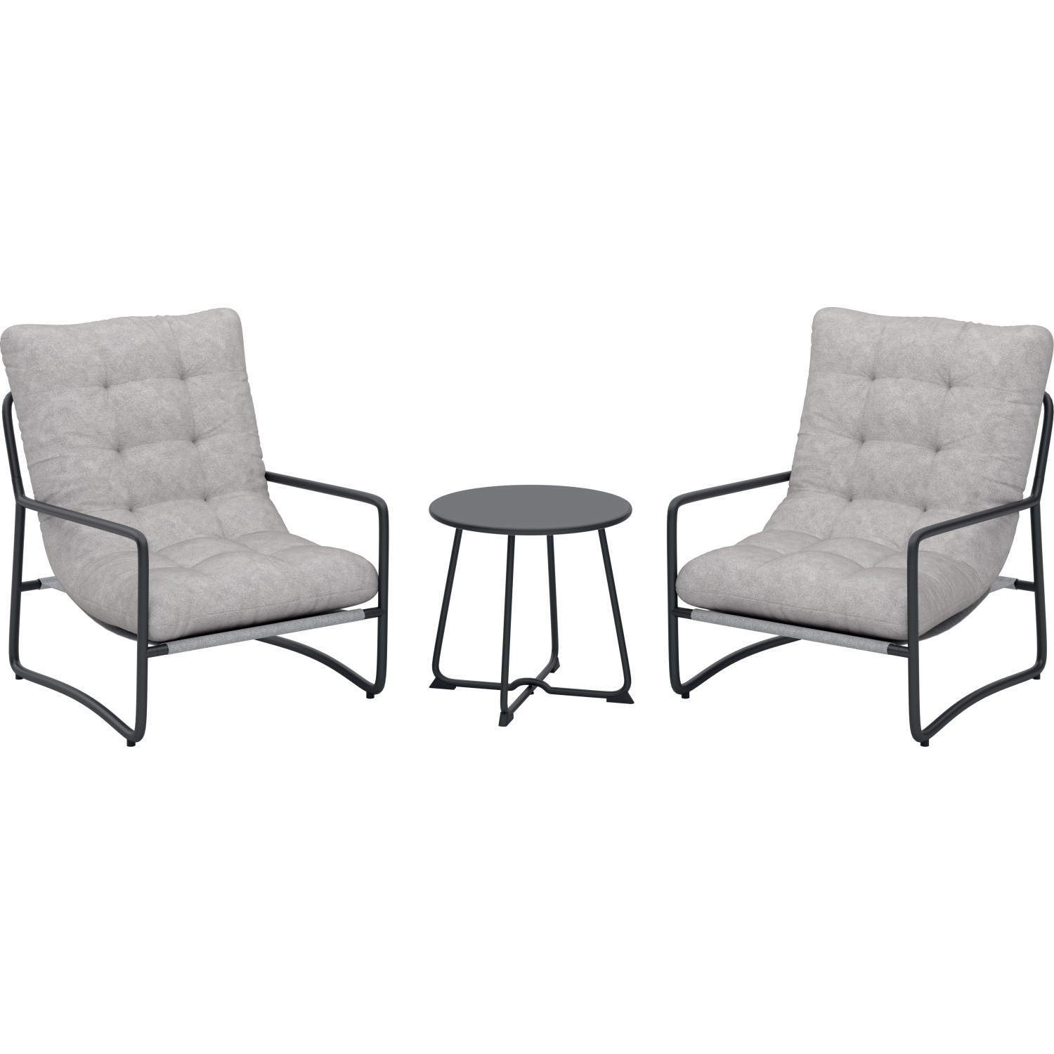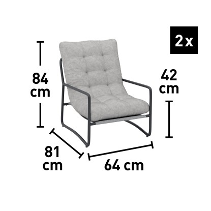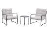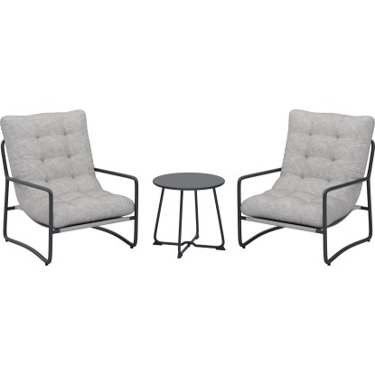 Il set include 2 sedie con cuscini imbottiti e 1 tavolino rotondo (Ø50xH45,5 cm) con piano in acciaio, perfetto per creare un angolo relax elegante e funzionale.
