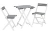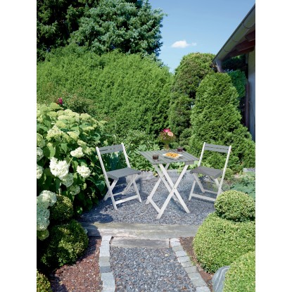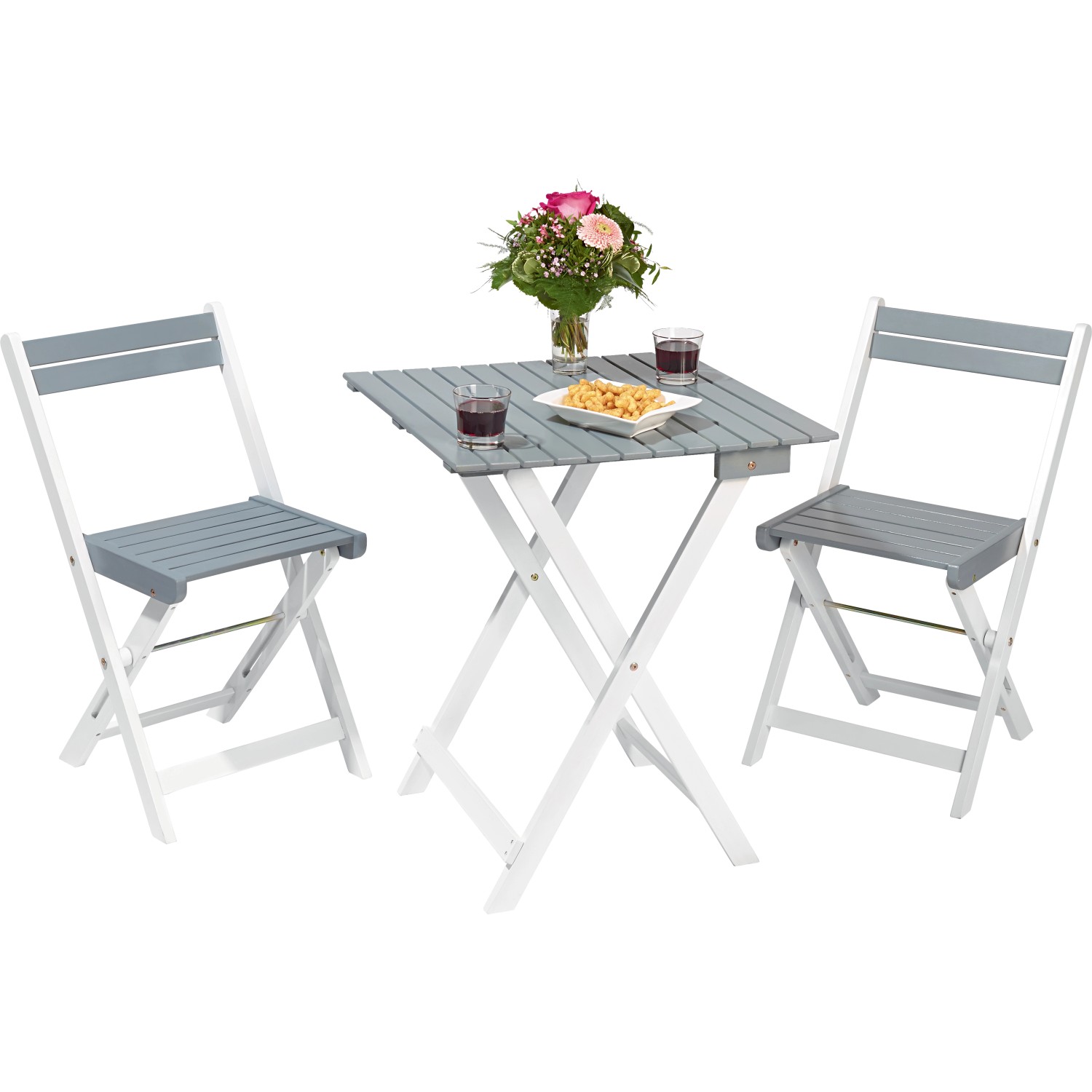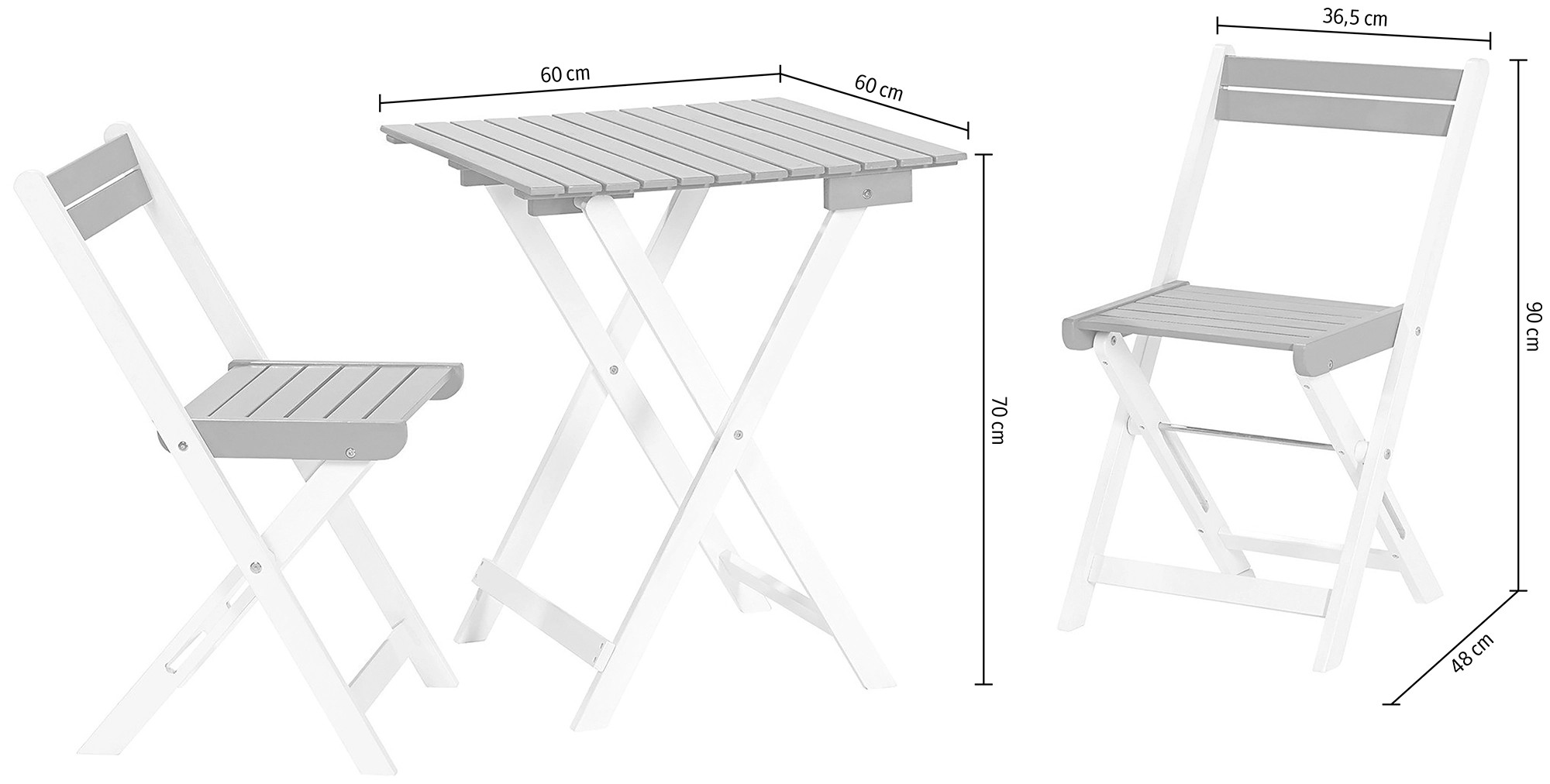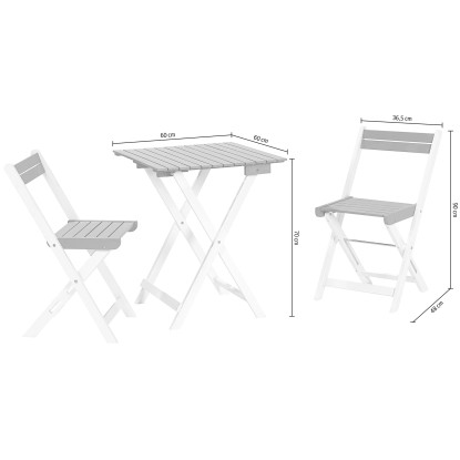 Set bistro pieghevole CMI in legno di acacia certificato FSC ideale per balconi e piccole terrazze. Composto da un tavolo da 70 cm x 60 cm x 60 cm e due sedie da 90 cm x 36,5 cm x 48 cm. Pieghevole, può essere comodamente riposto in poco spazio. Combinazione cromatica: grigio-bianco.