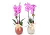 Composizione in vaso ceramica con Phalenopsis. Questa è l`orchidea più diffusa al mondo. Ama il caldo, temperatura ottimale 23-24°. Hanno bisogno di luce ma non diretta. Le sue radici devono essere costantemente umide, pertanto in estate è opportuno innaffiare due volte la settimana in inverno solo una volta.